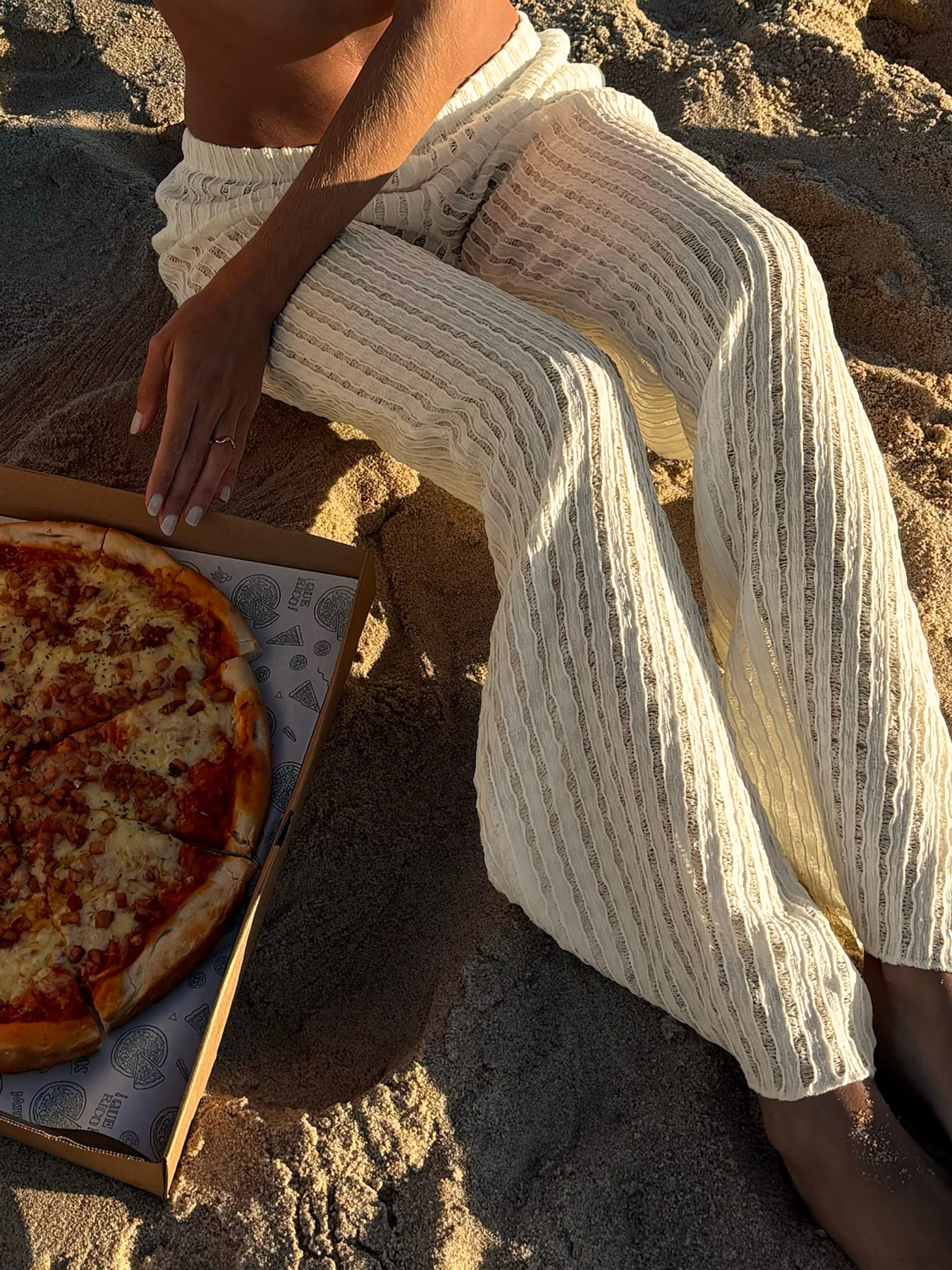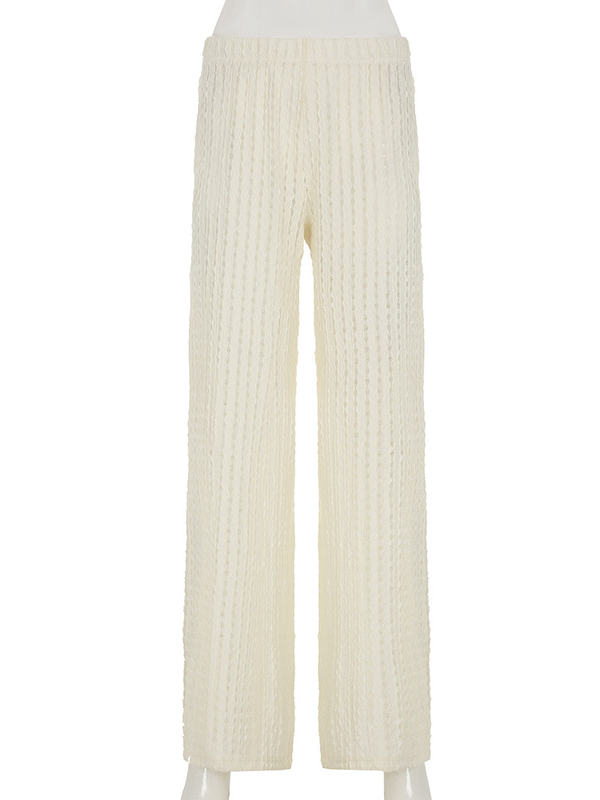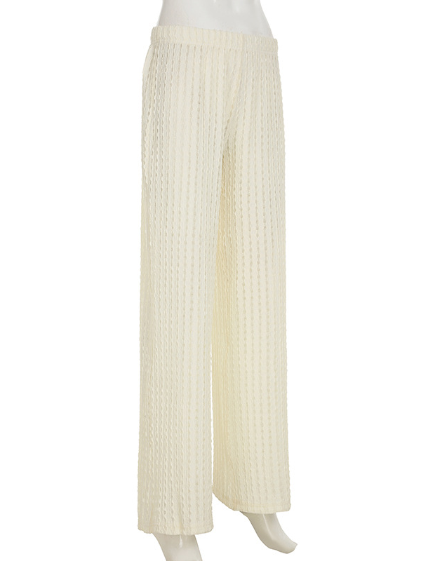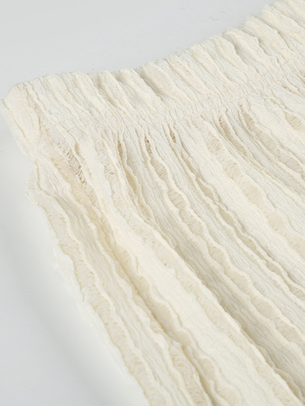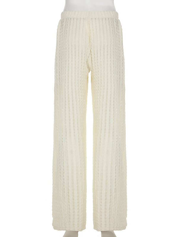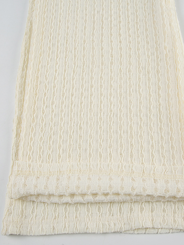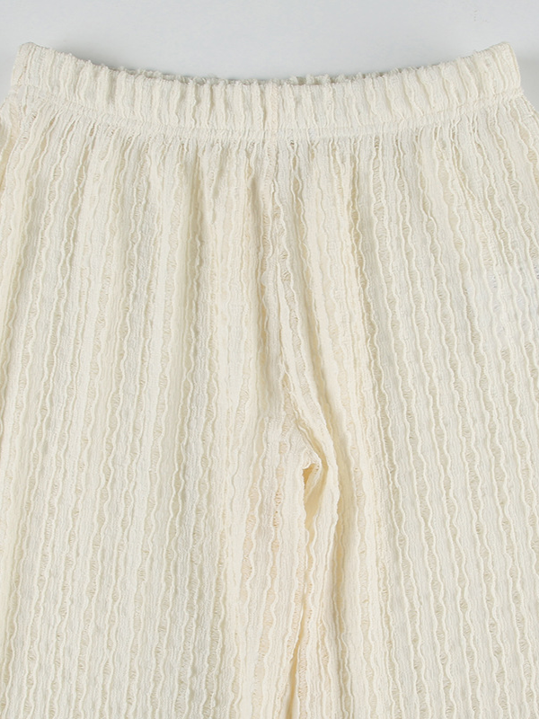 シアー感のあるナチュラルな抜け感を演出するパンツは、ウエストゴム仕様で伸縮性もあるので、イージー・ノンストレスな履き心地◎