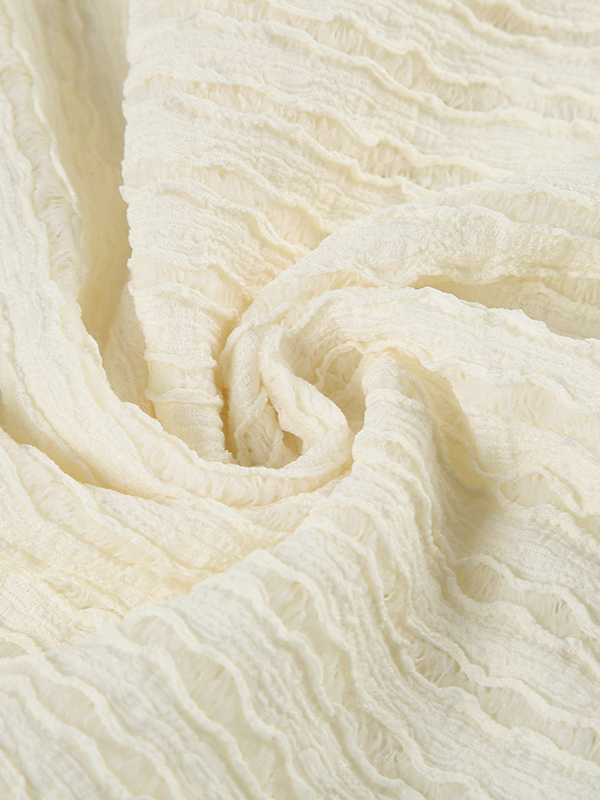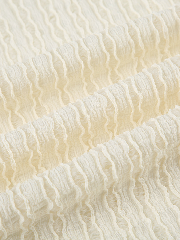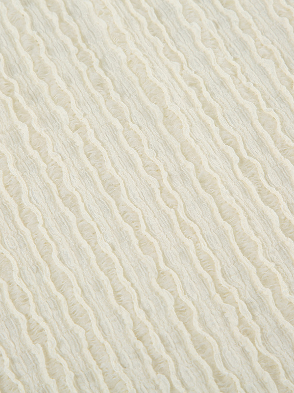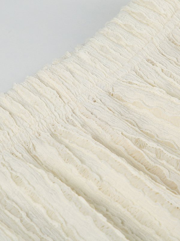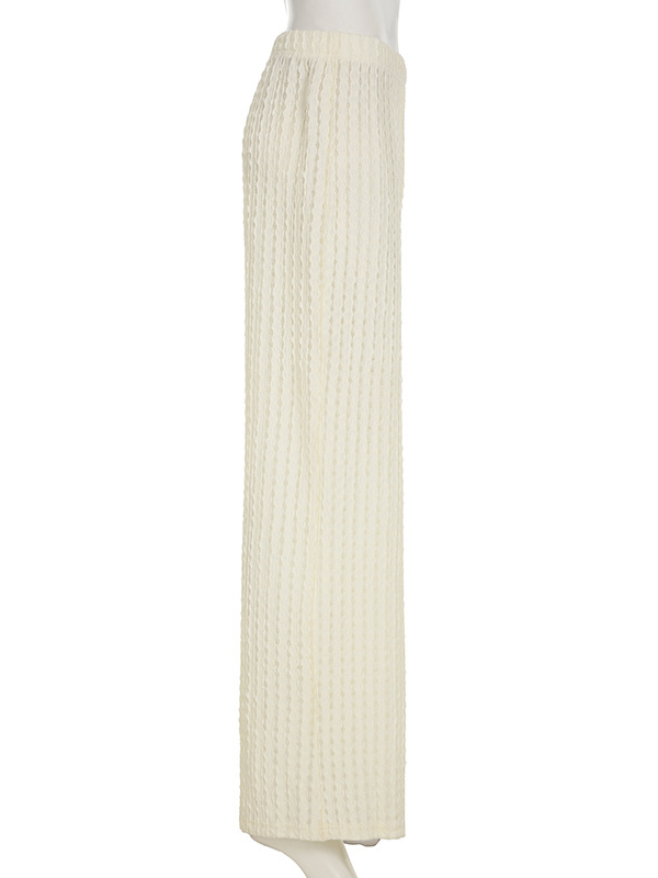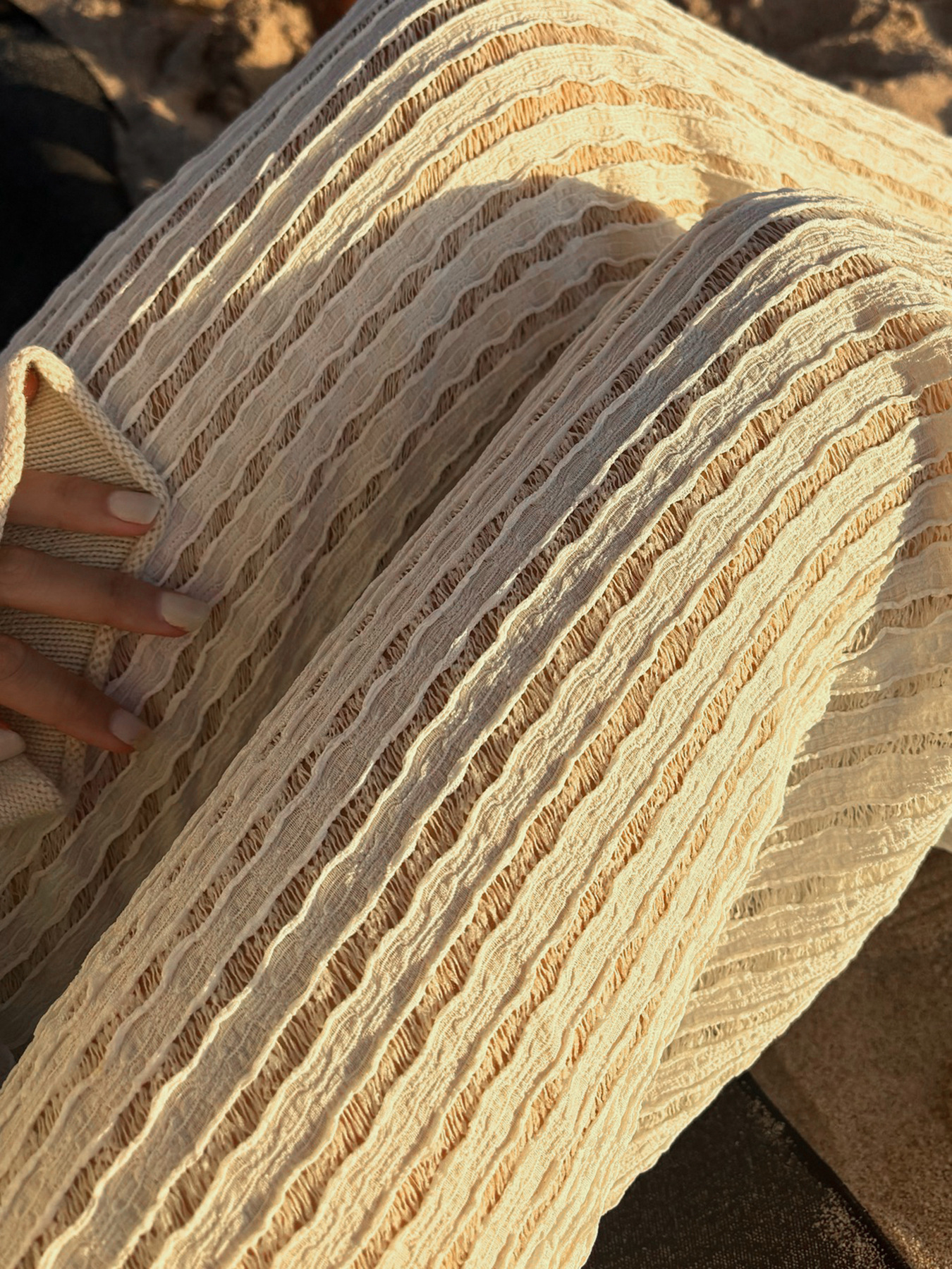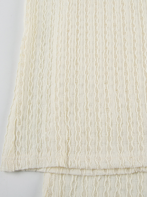 シアー感のあるナチュラルな抜け感を演出するパンツは、ウエストゴム仕様で伸縮性もあるので、イージー・ノンストレスな履き心地◎