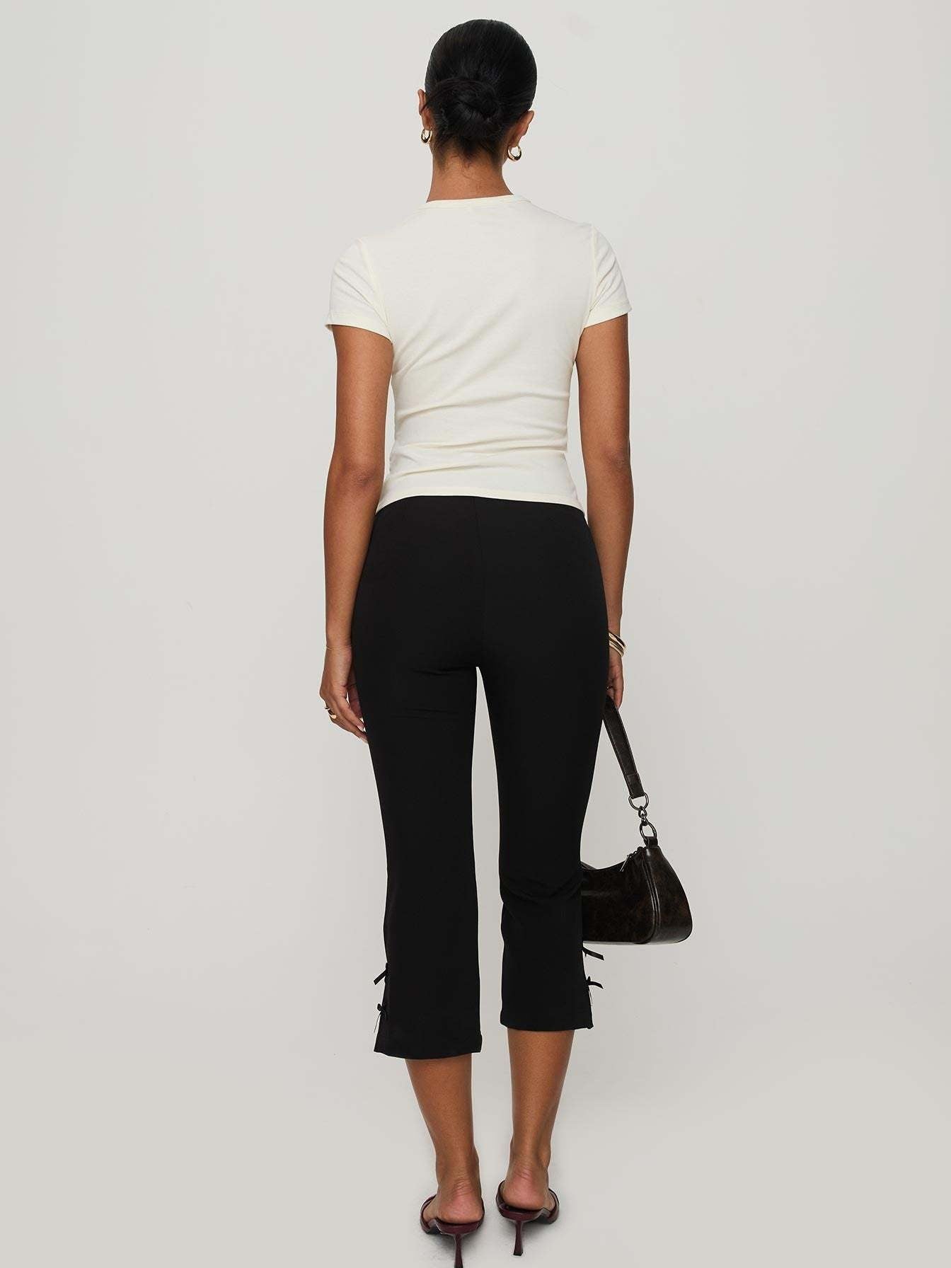 トレンドのカプリパンツは、裾にダブルリボンが施されキュートな印象に◎