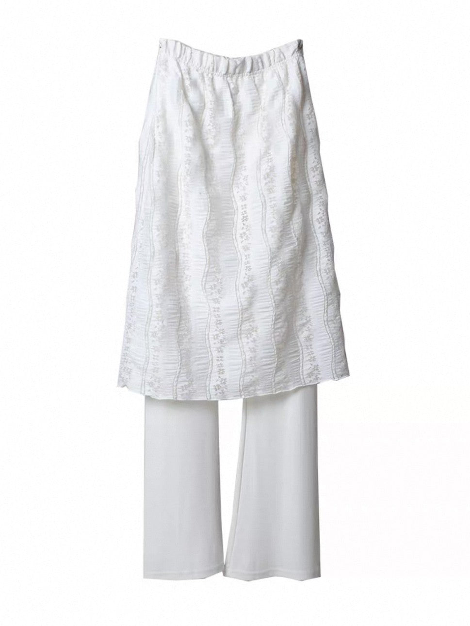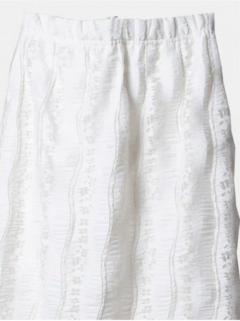 スカート部分は凹凸のある生地で、上品な立体感。裾はゆらっと揺れるラインでナチュラルな刺繍風の柄がやさしい印象。縦ラインが入っているから、脚がきれいに見える効果も◎