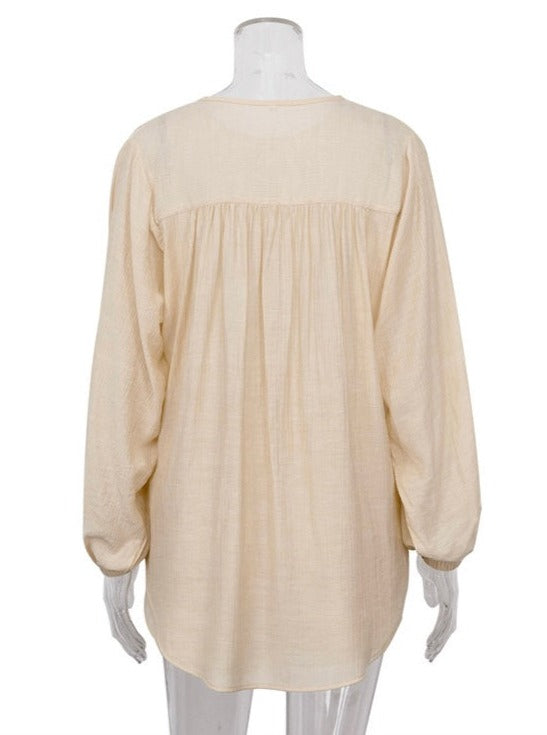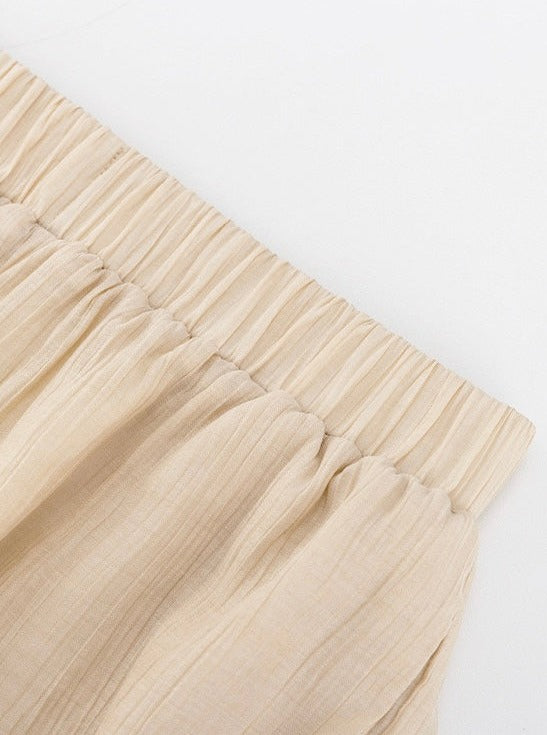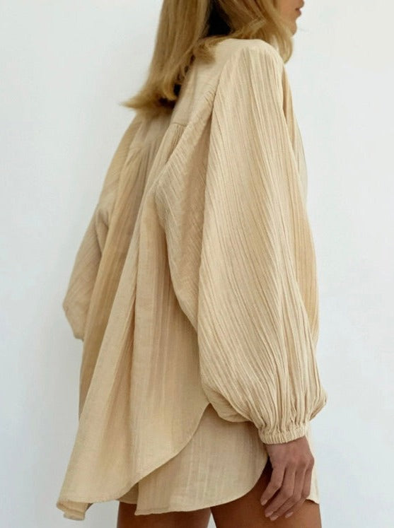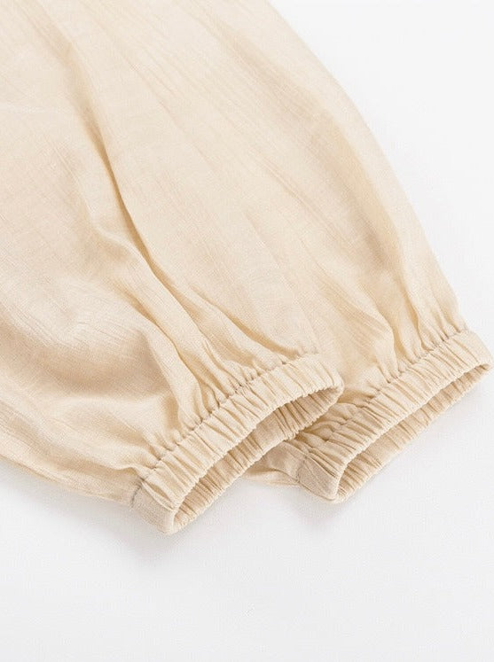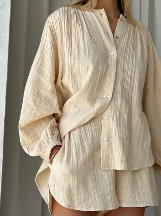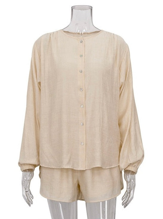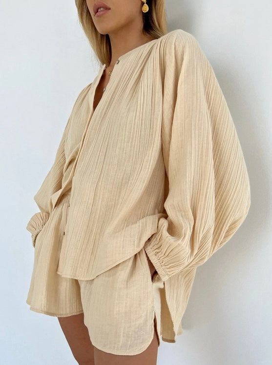 ノーカラーのスッキリとした衿ぐりラインから袖先にギャザーが入った優しいバルーンスリーブのシルエットにシェルボタンが輝くブラウスと、ウエストゴム仕様でサイドにはポケットも付属したインナー付きのショートパンツのセットとなっています。