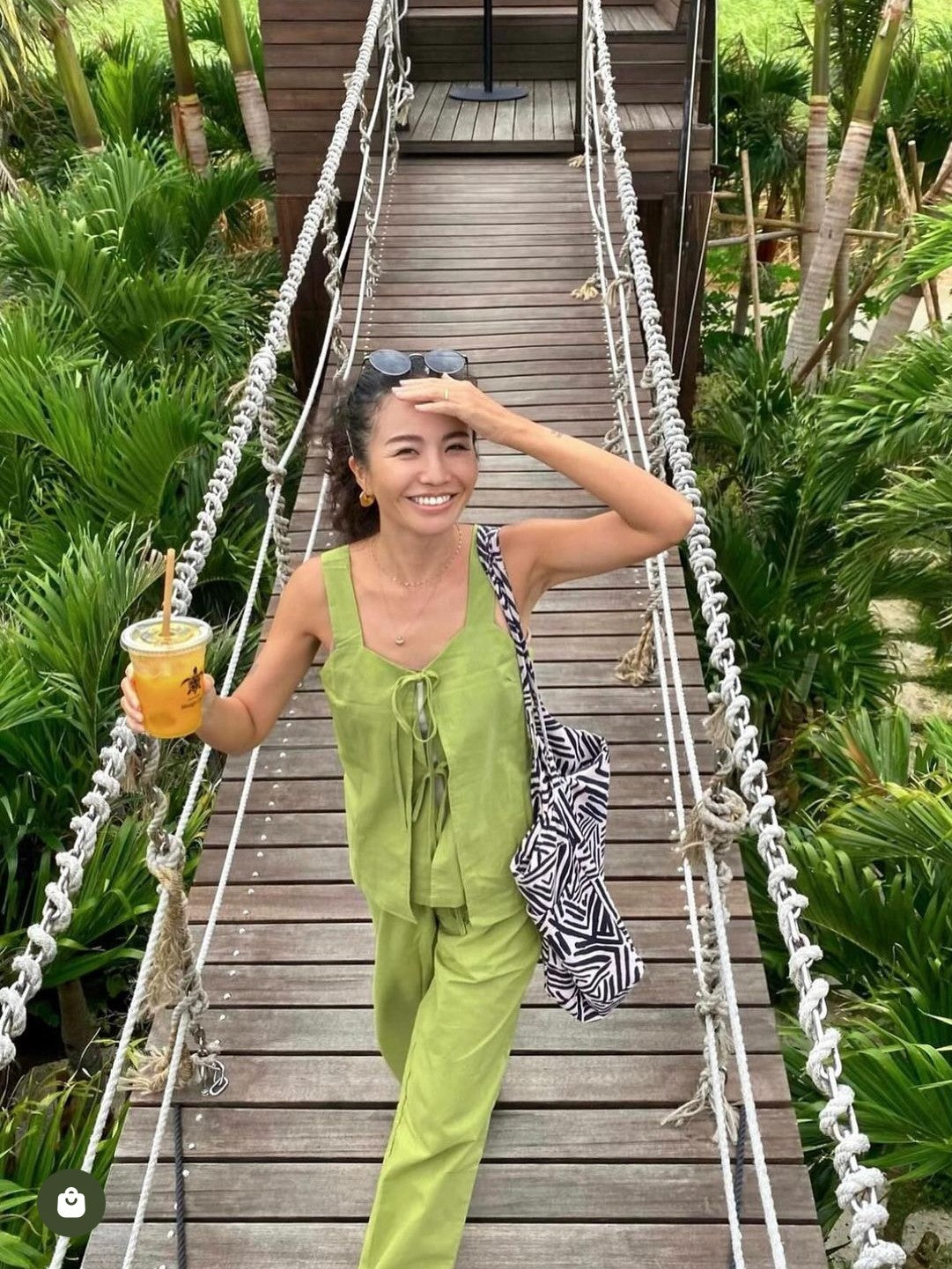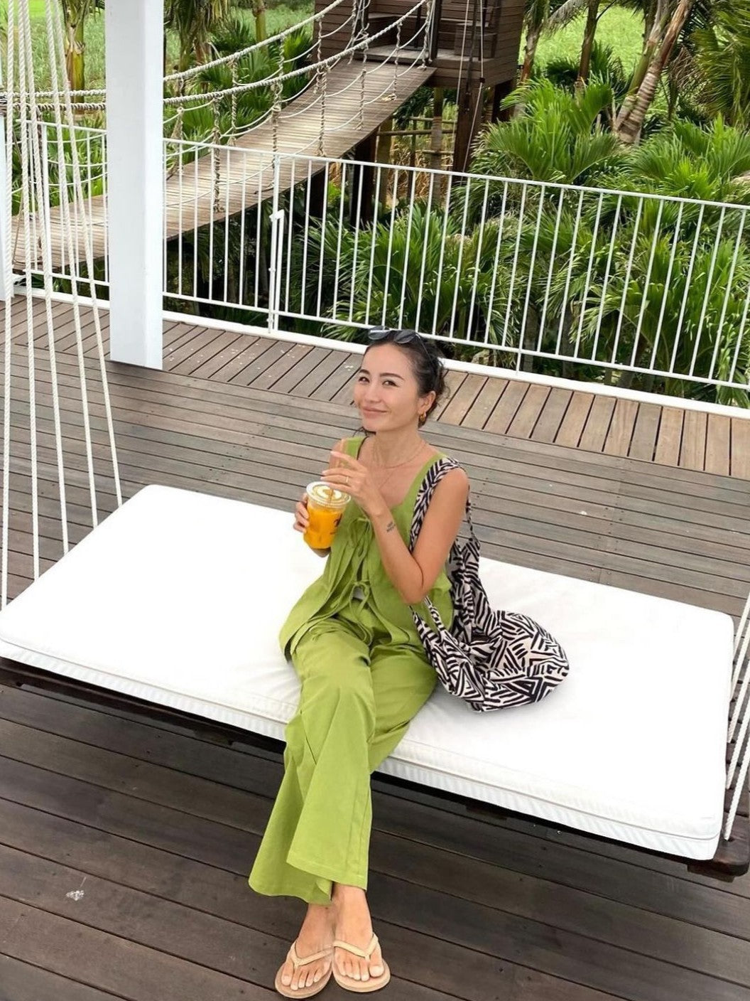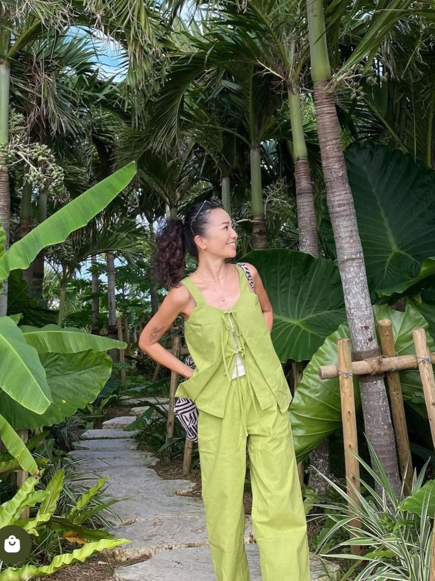 リラックスムード漂うグリーンフロントリボントップパンツセットアップです。