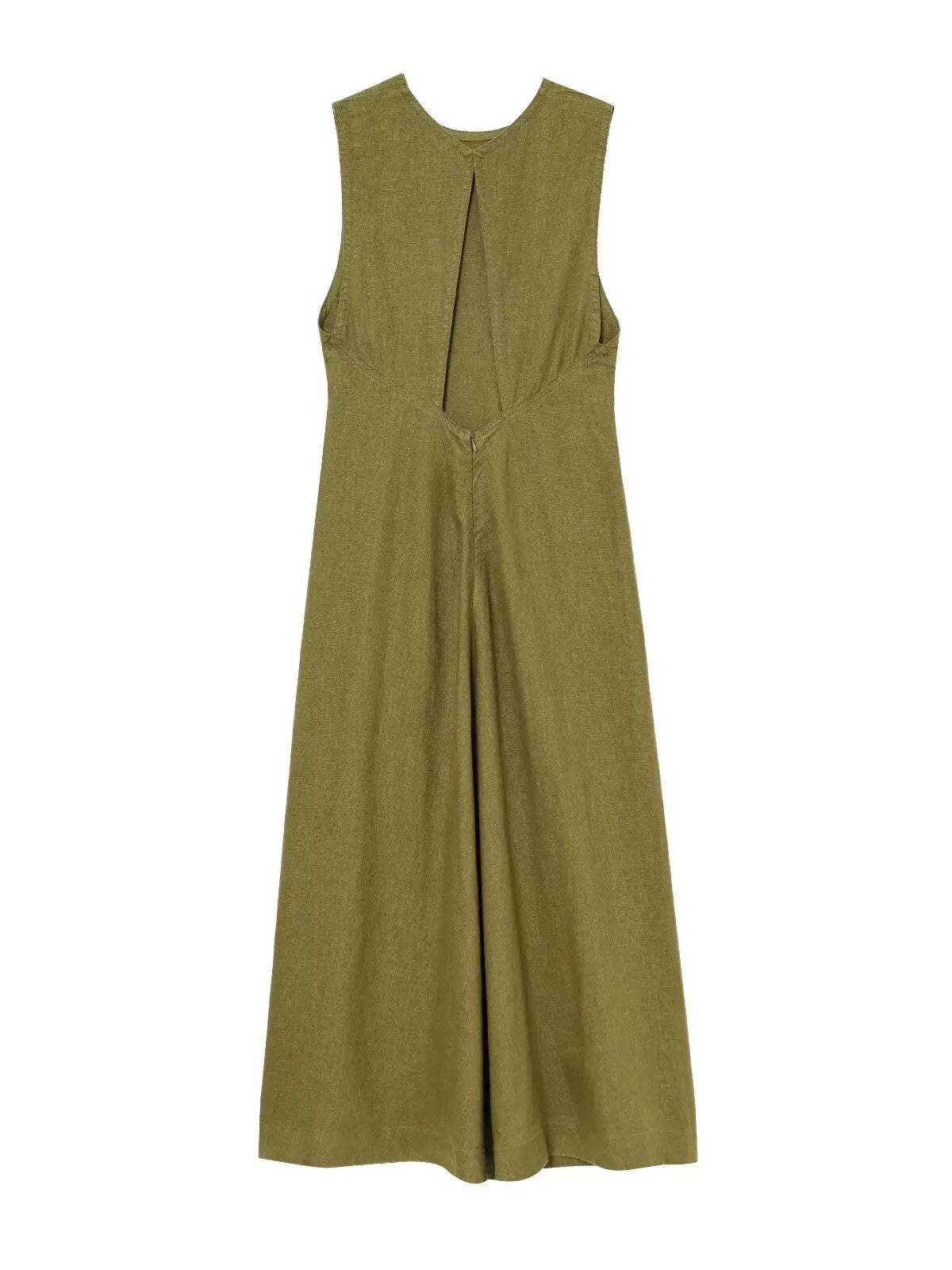 落ち着いたオリーブカラーが目を惹く、綿麻素材のロングワンピース。
