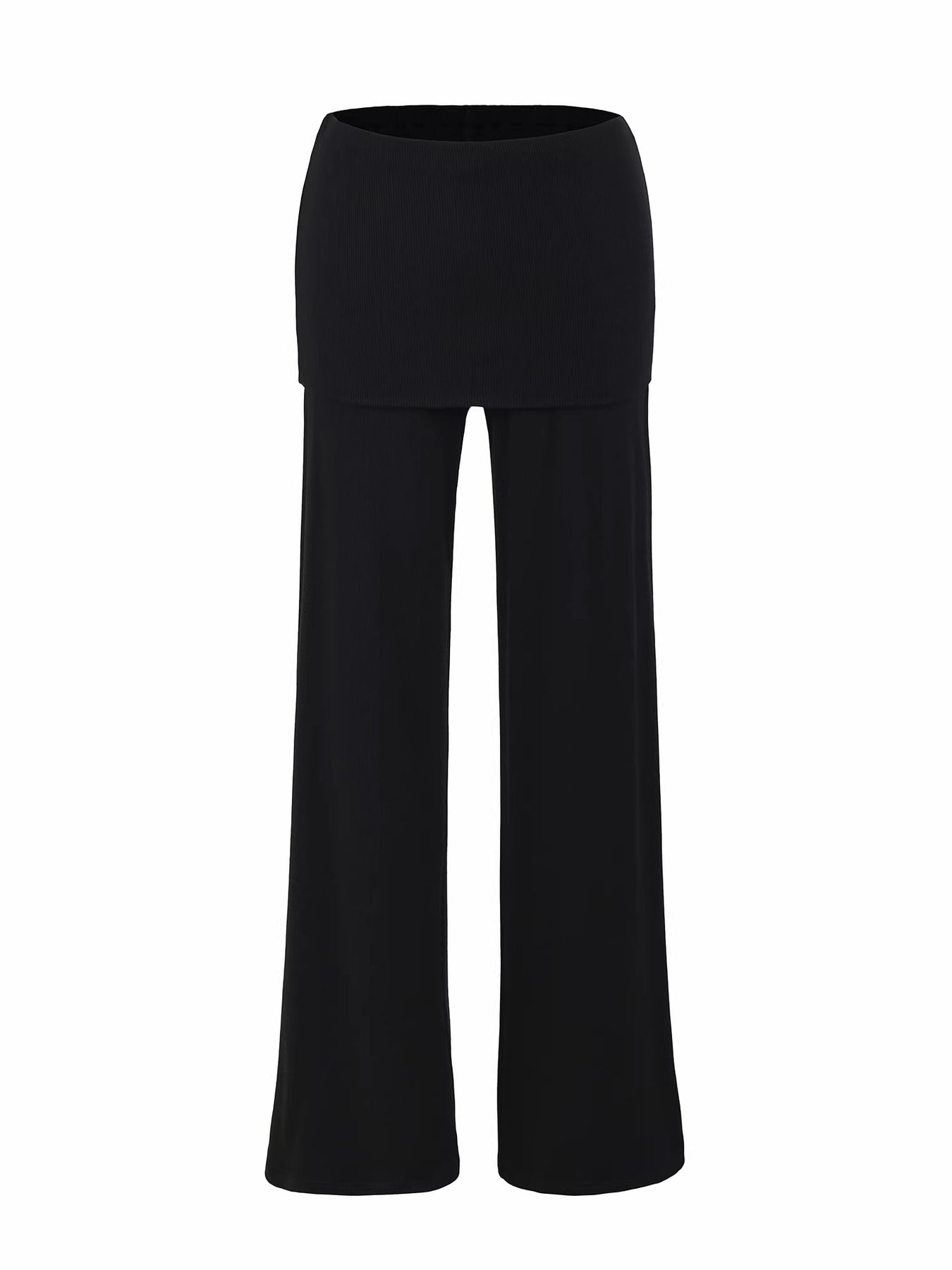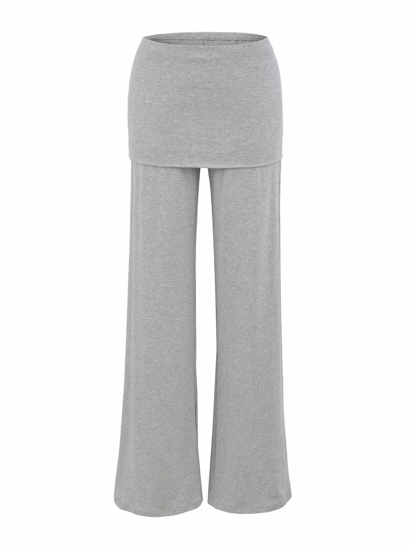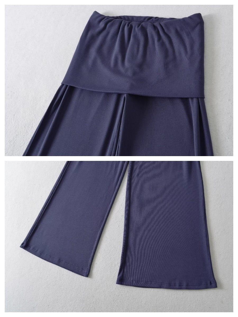 柔らかなリブ素材で快適な着心地を叶える、スカートライクなレイヤードデザインのフレアパンツ。