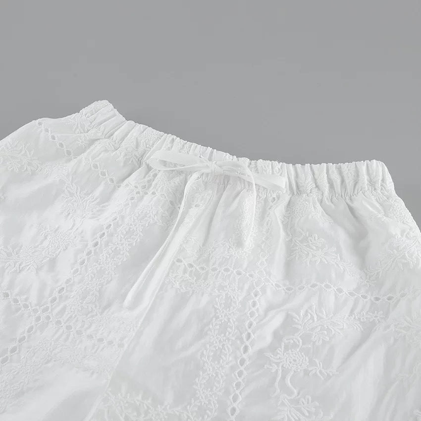 パンツはワイドなシルエットで、リラックス感と美しい落ち感を両立。全体に施されたレース刺繍が統一感を生み、セットアップとしての完成度を高めています。ウエストはストレスフリーな仕様で、デイリーにも取り入れやすい仕上がりに。パンツは嬉しいインナー付き◎