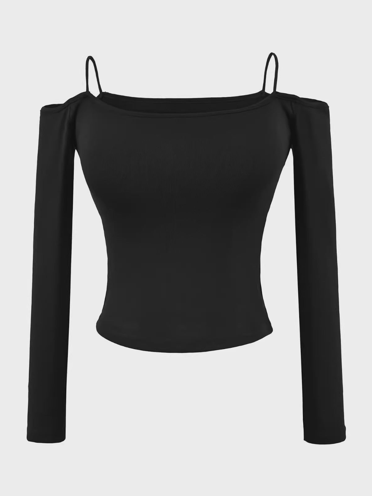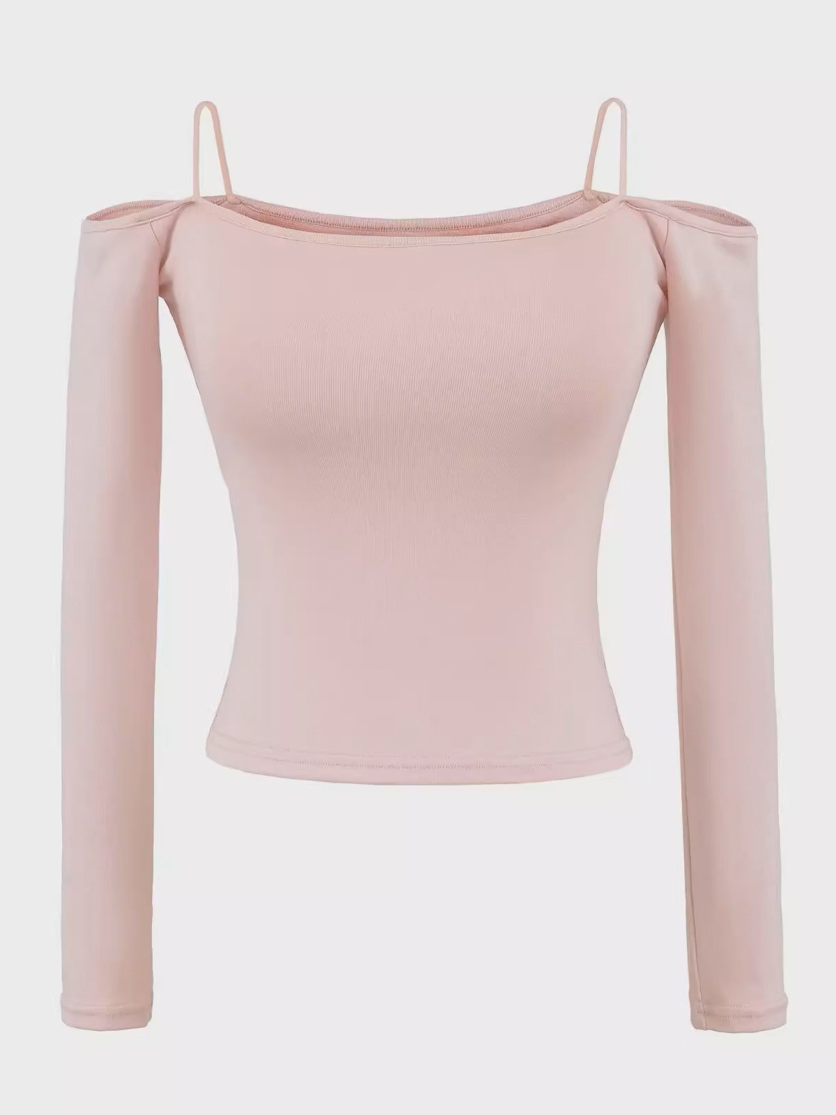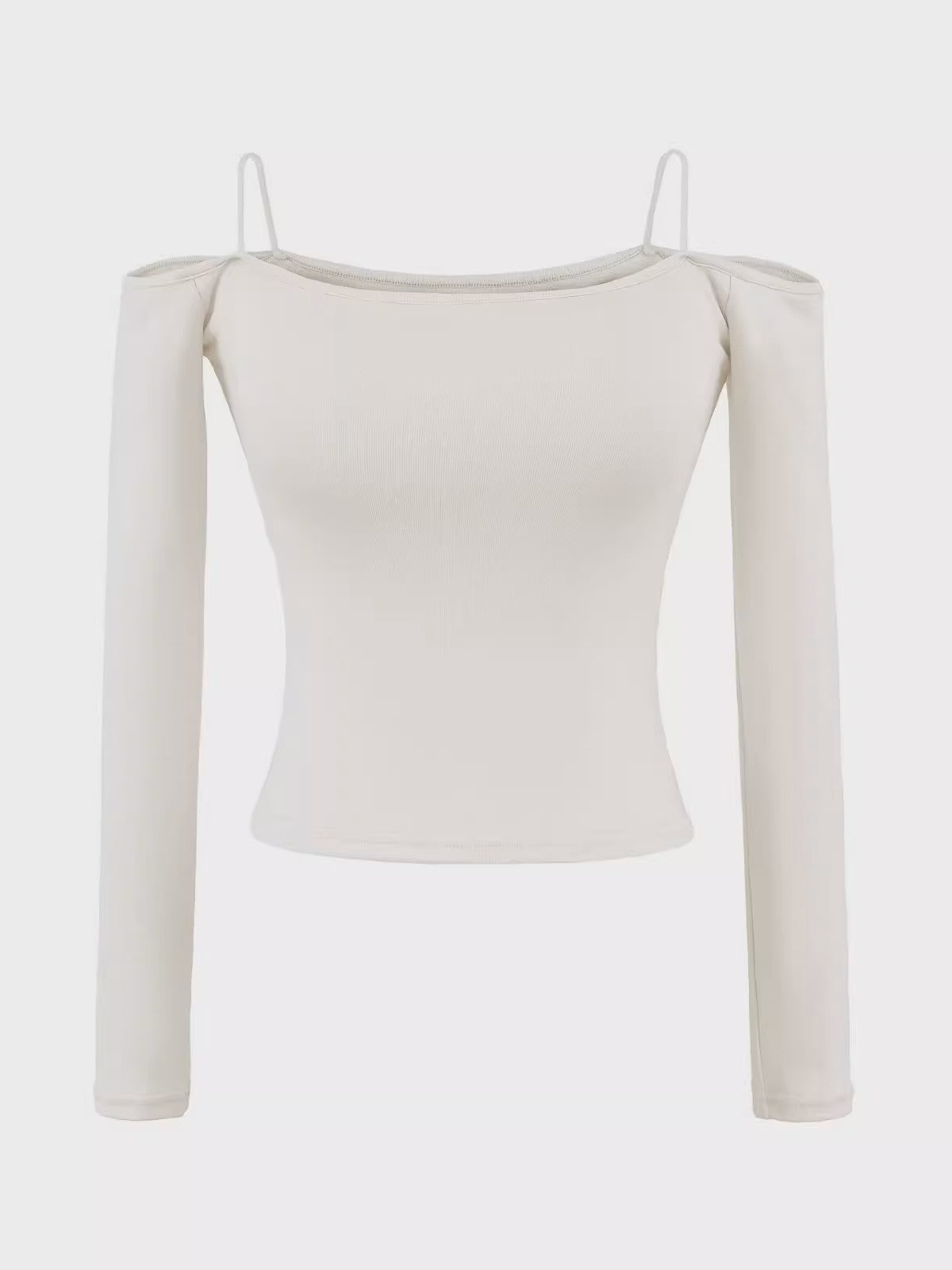 女性らしいデコルテラインを美しく見せる、オフショルダーデザインの長袖トップス。華奢なストラップがさりげないアクセントに。