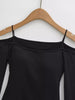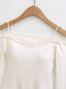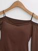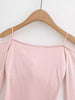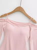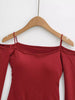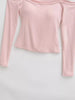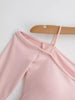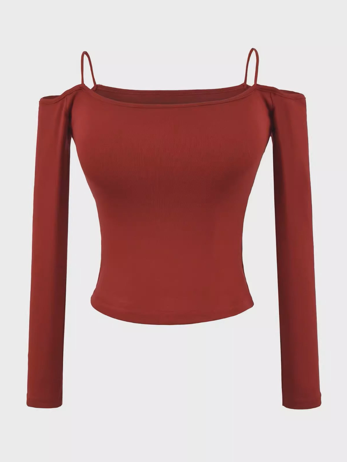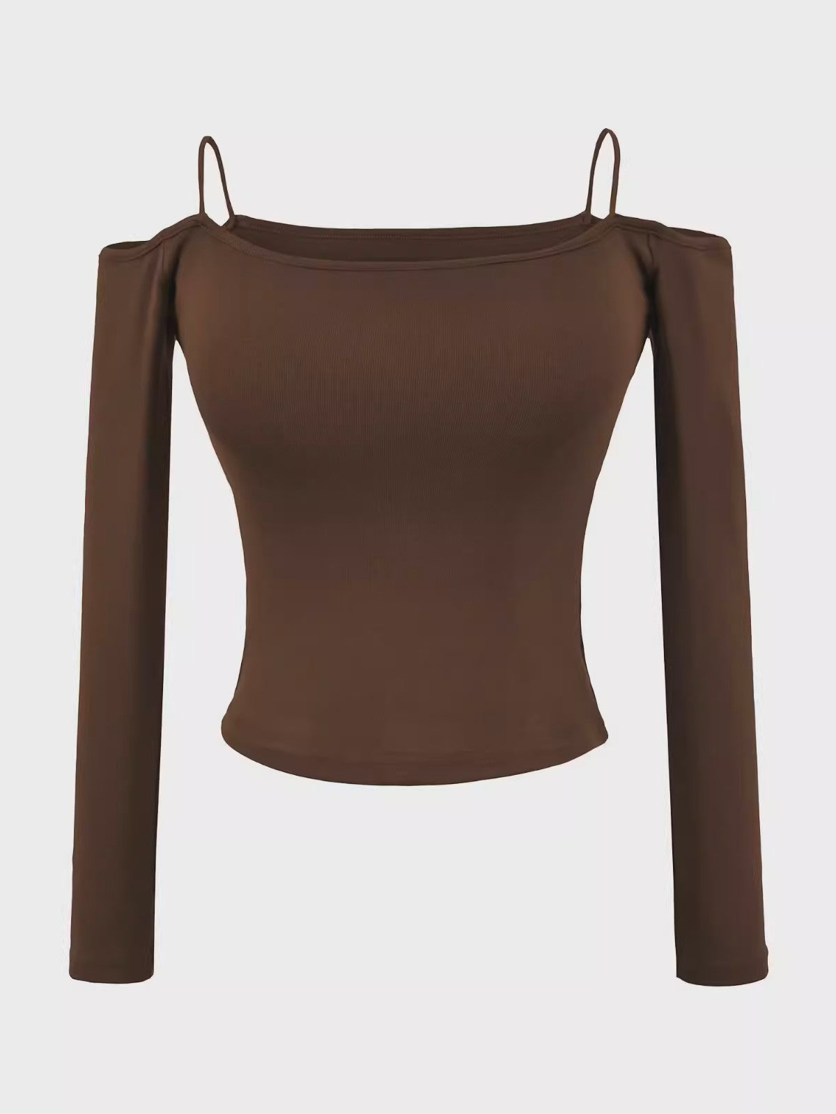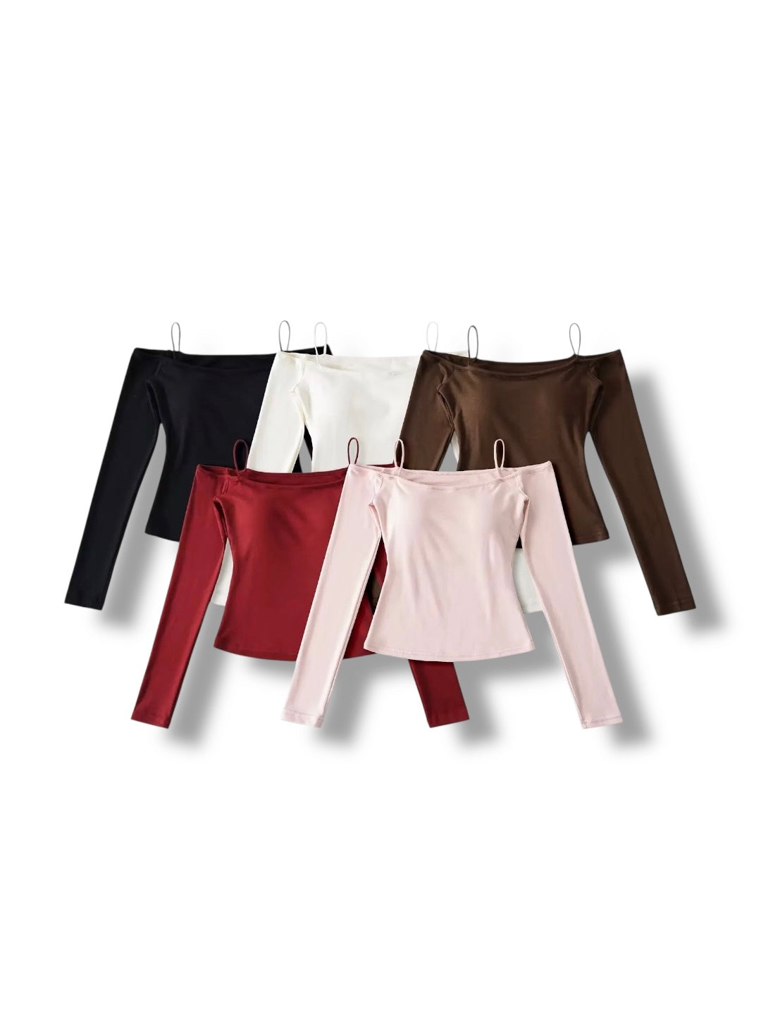 女性らしいデコルテラインを美しく見せる、オフショルダーデザインの長袖トップス。華奢なストラップがさりげないアクセントに。