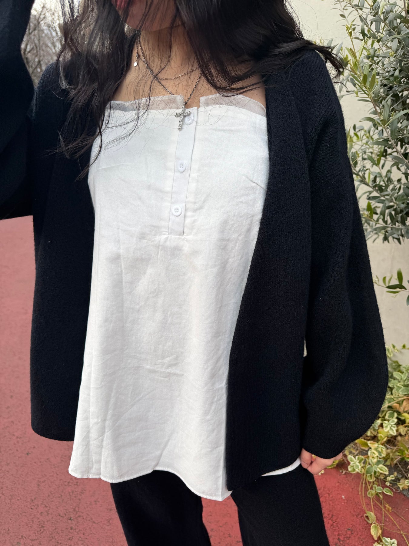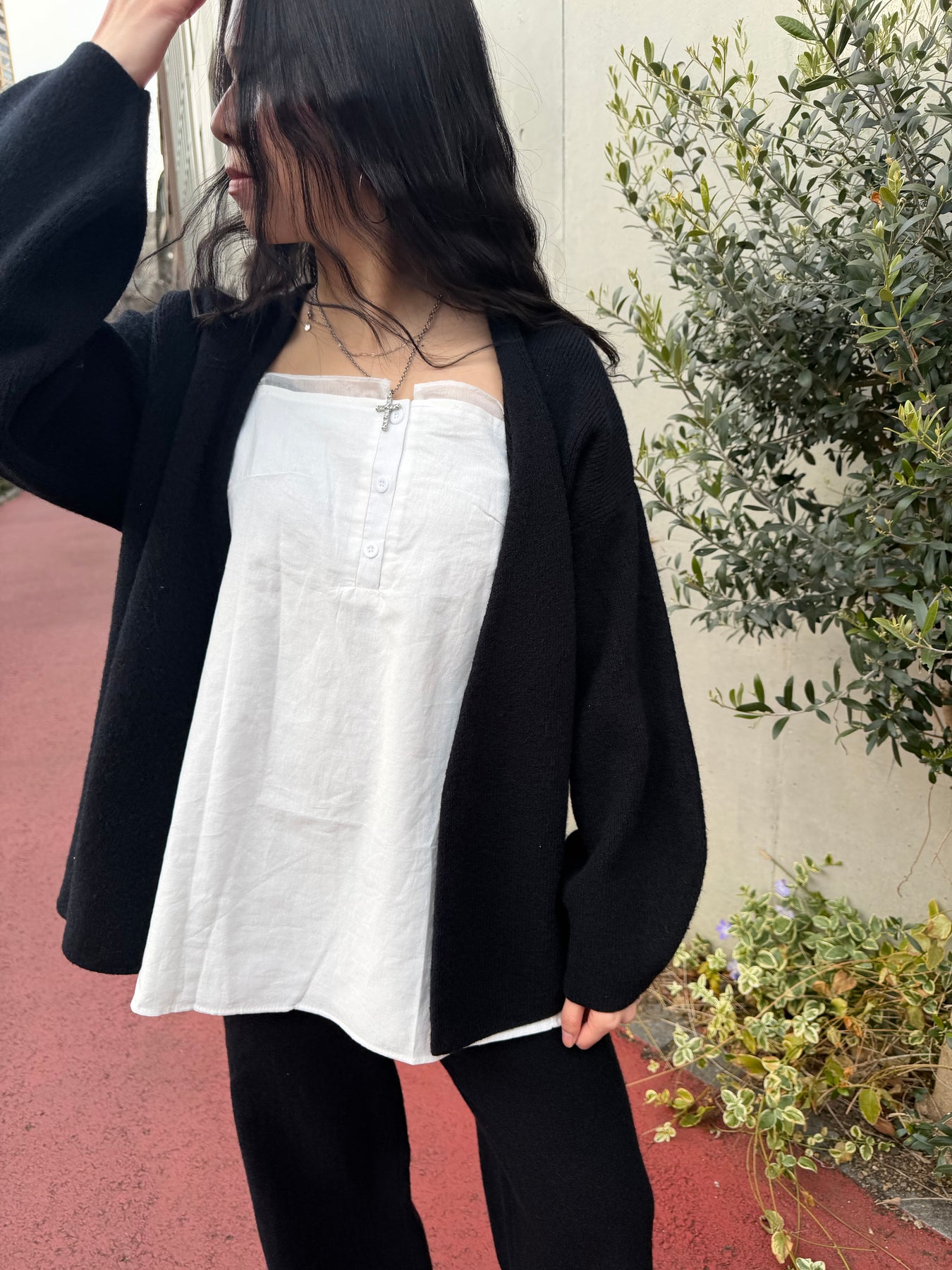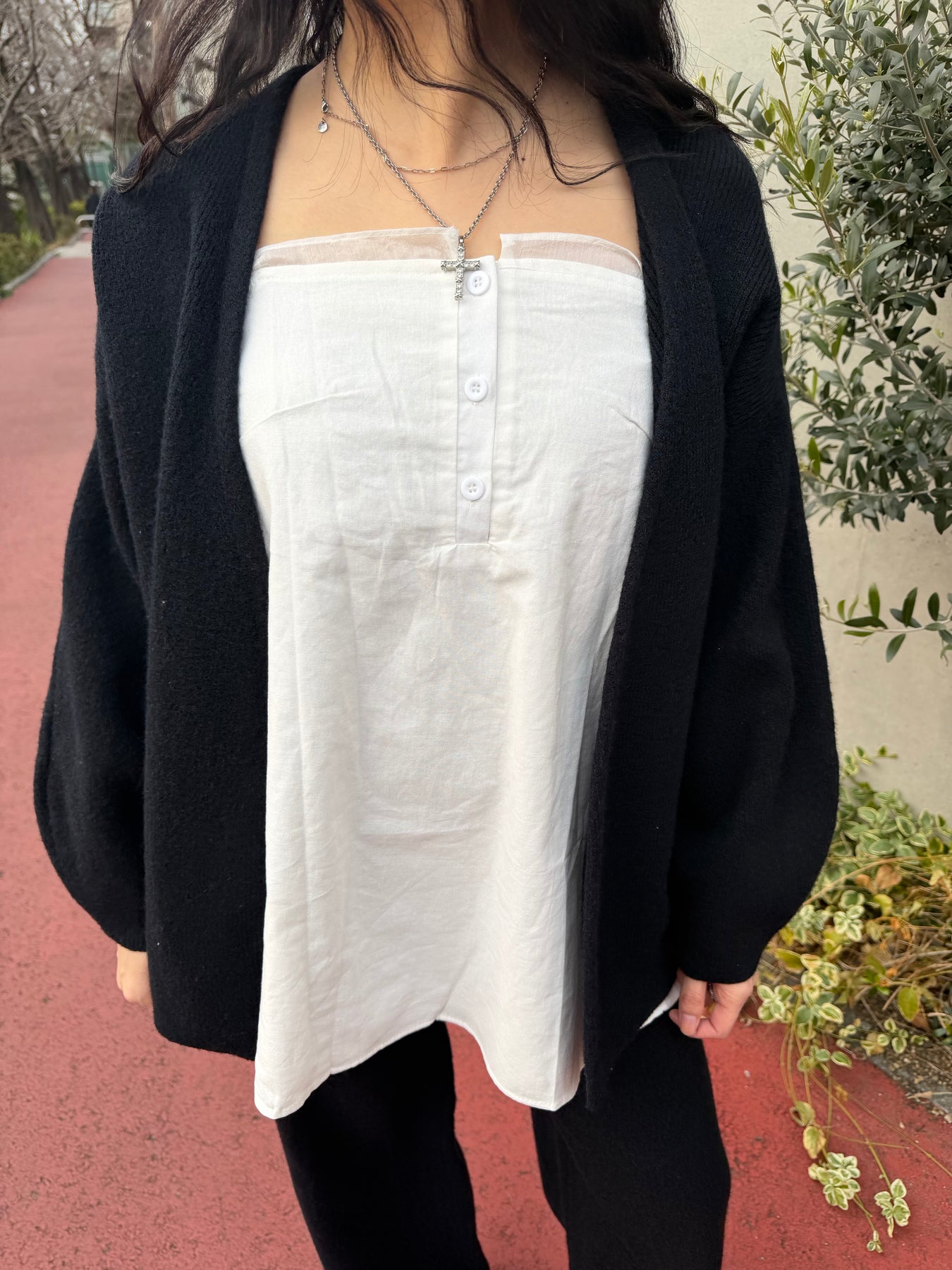 胸元にはさりげないボタンディテールをあしらい、ミニマルな中にアクセントをプラス。さらにネックラインには、ほんのり透け感のあるチュールライクなシアー素材の生地を重ね、さりげない抜け感と女性らしい繊細さをプラスしています。