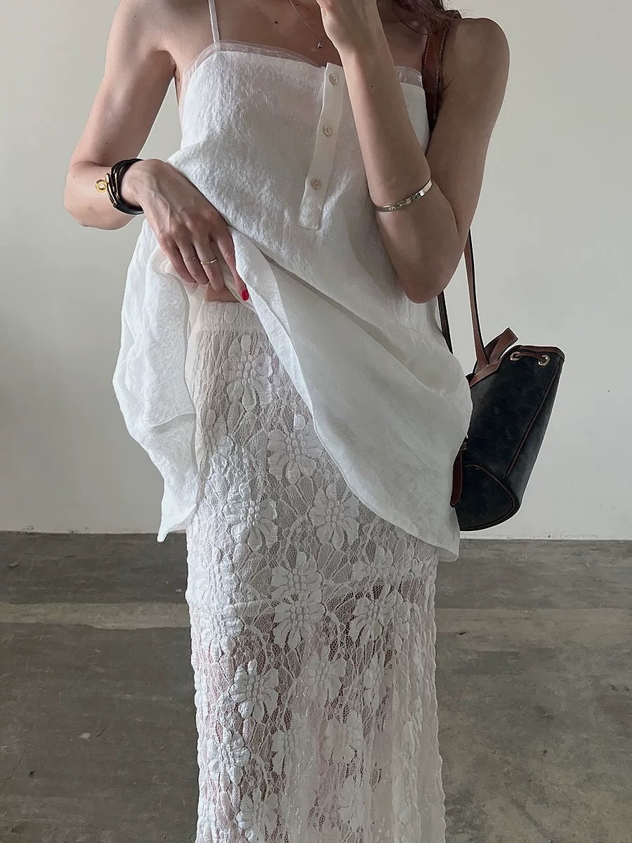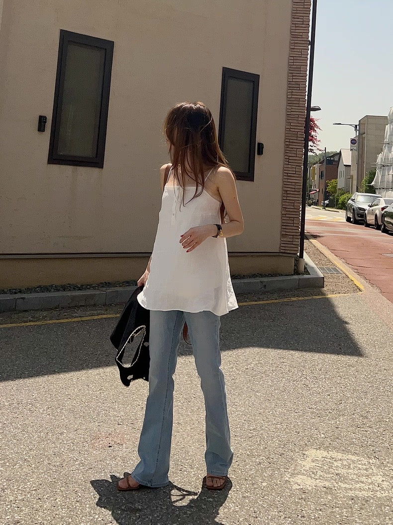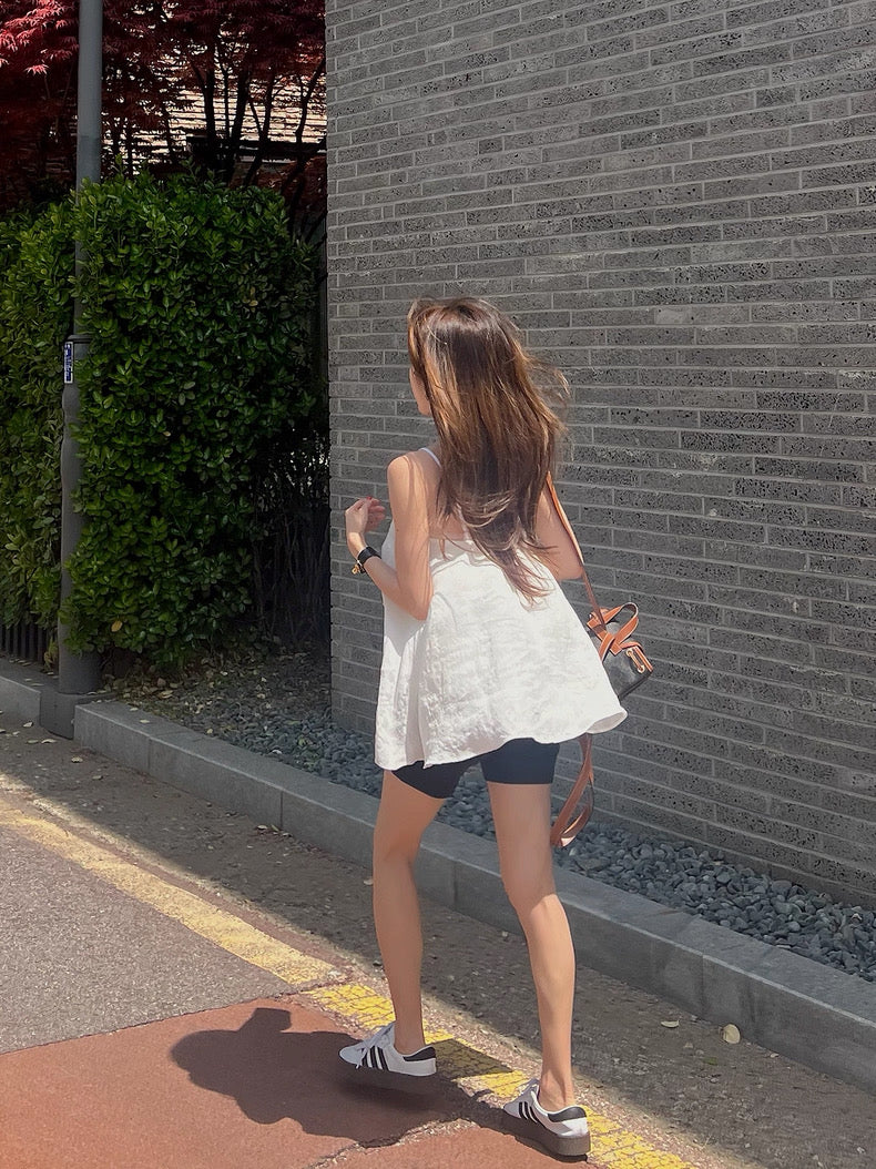 華奢なストラップと、ナチュラルなフレアシルエットが、動くたびに優しく揺れ、自然体でフェミニンな雰囲気に。