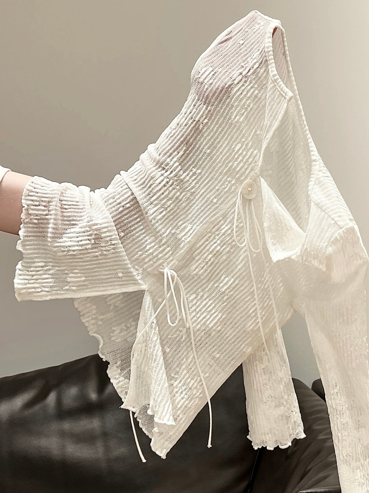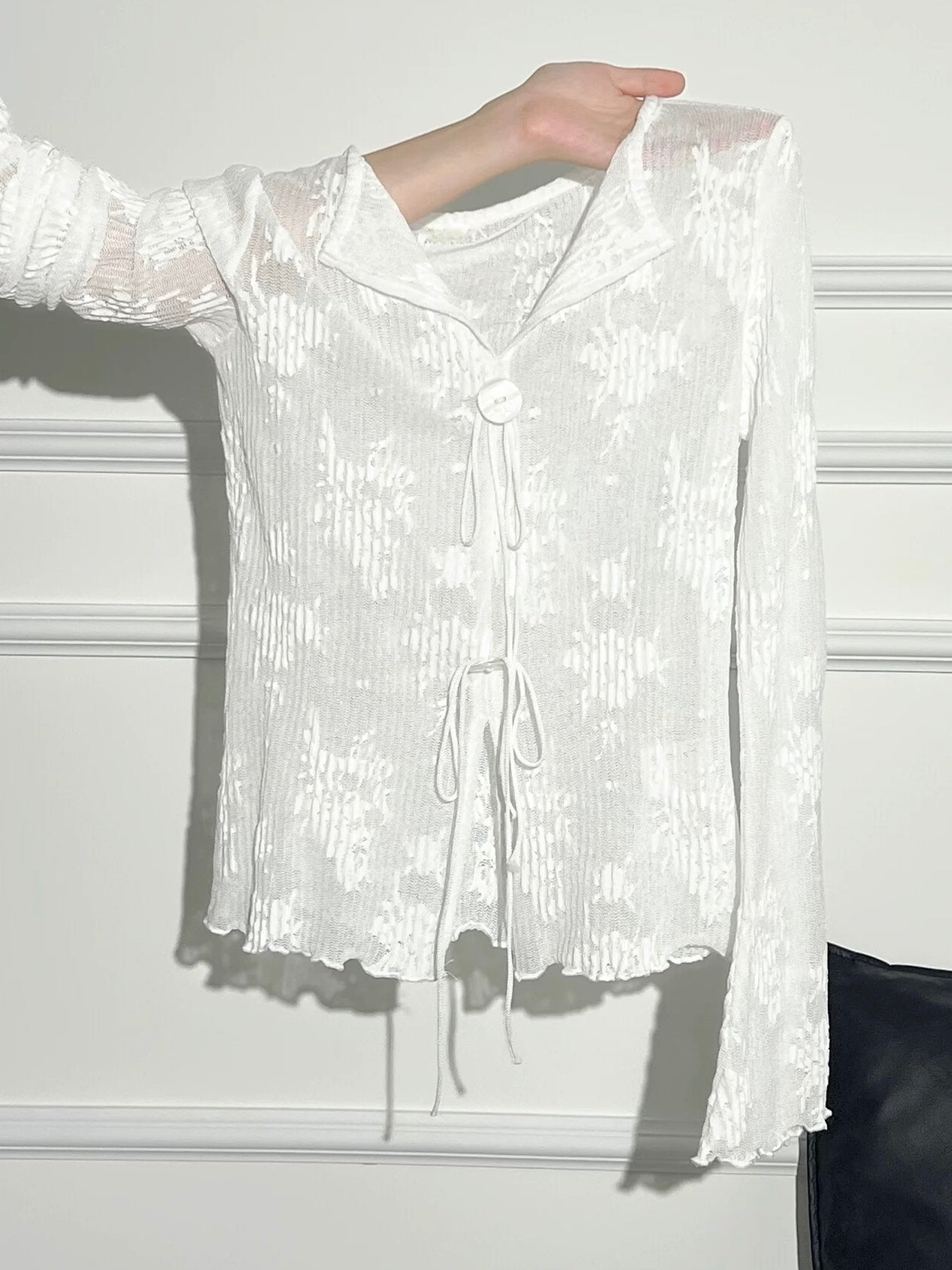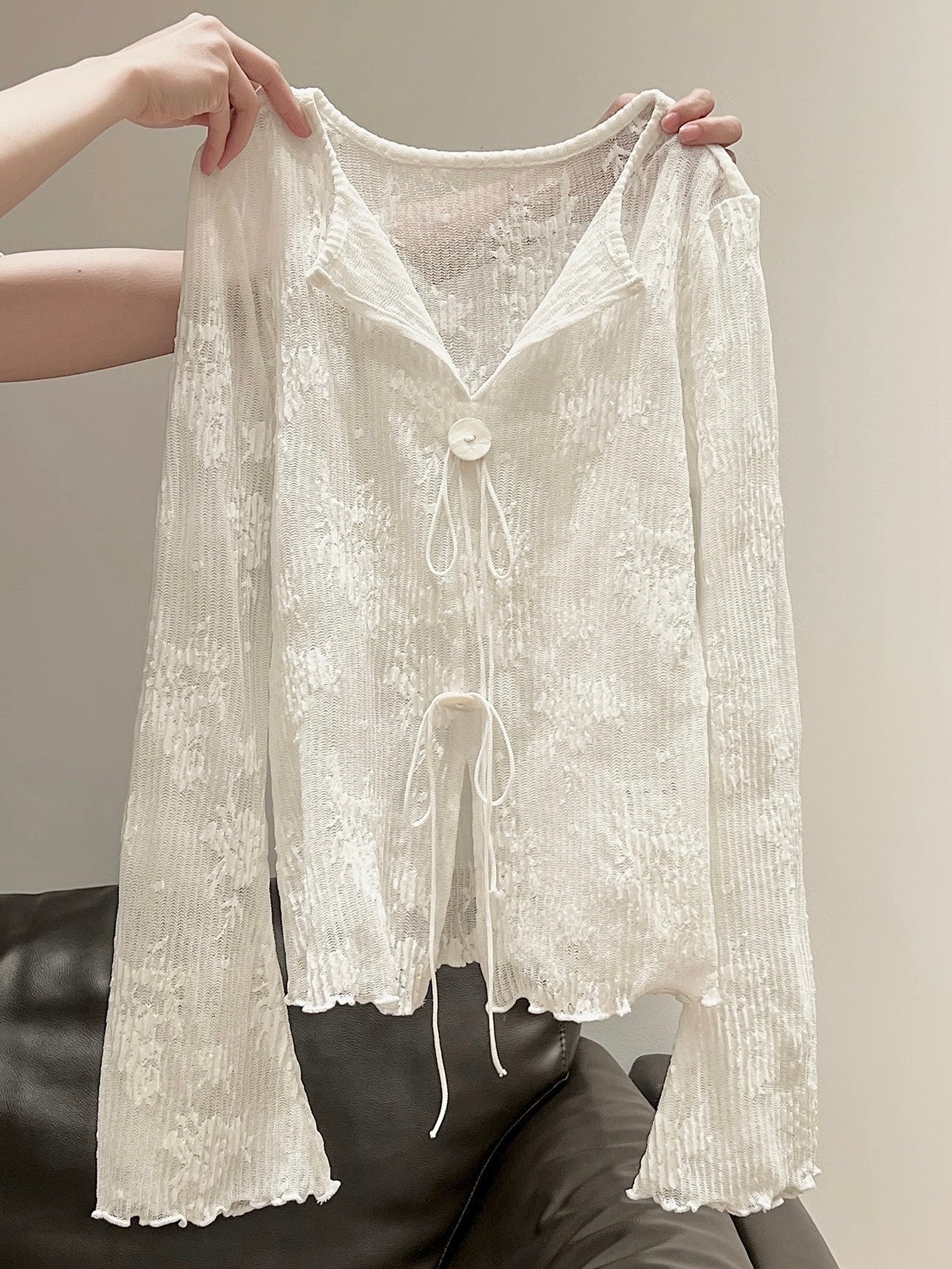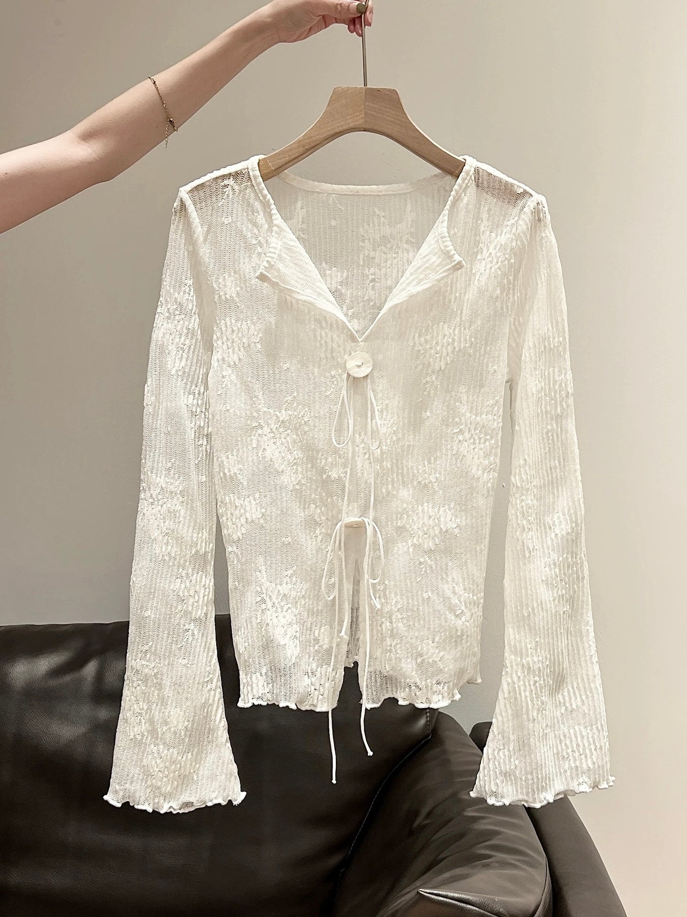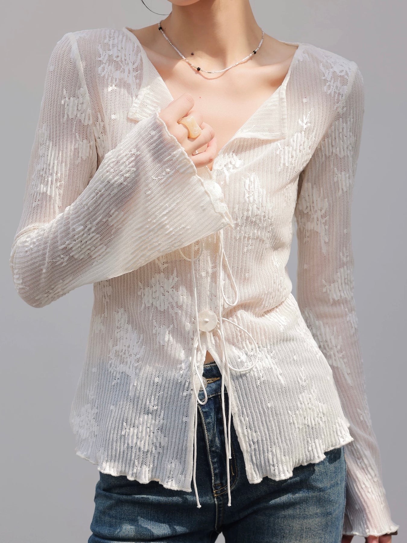 繊細な透け感と立体感のあるジャカードが目を惹く、フェミニンなカーディガン。