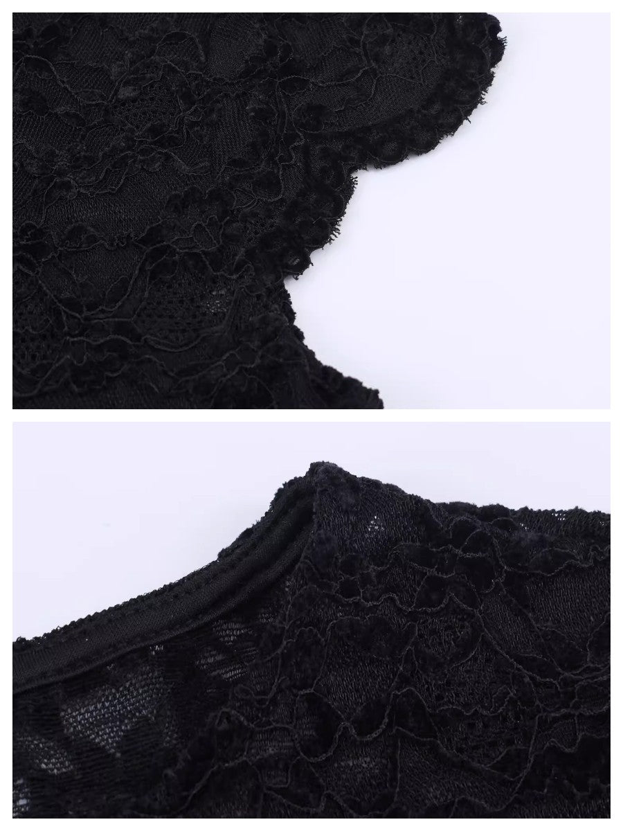 繊細なレース素材が印象的な、シアー感のあるコンパクトなトップス。