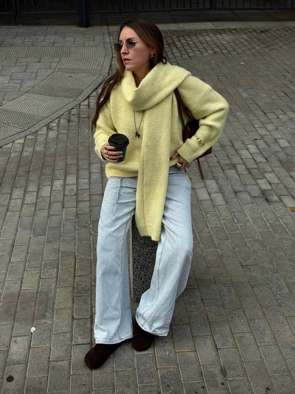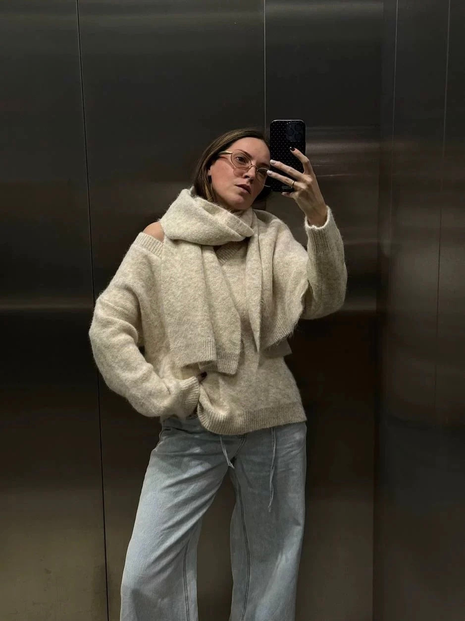マフラー付きVネックセーター