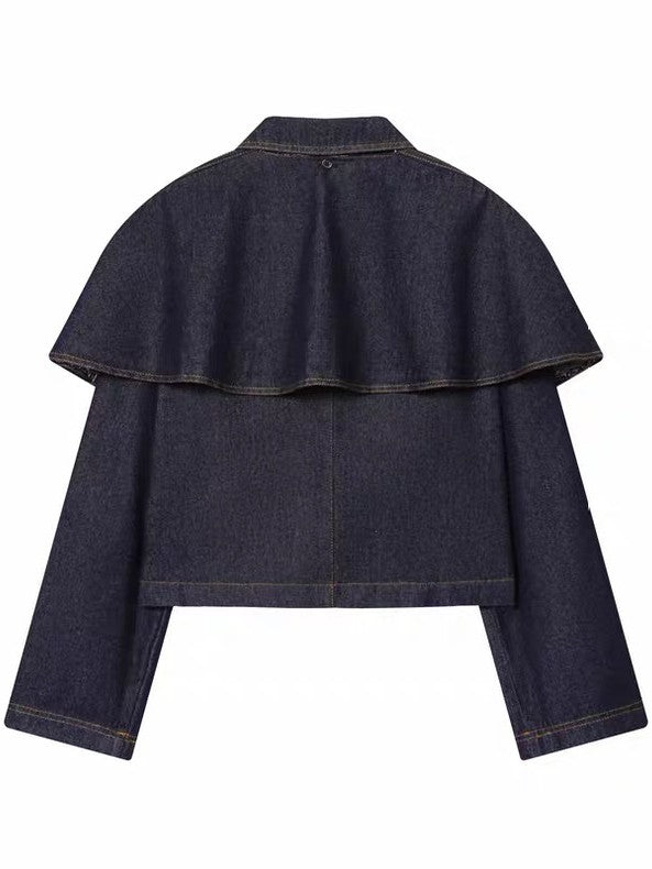 ノンウォッシュのデニムジャケットにショールデザインが施され、モダンなレディーライクな仕上がりに。
