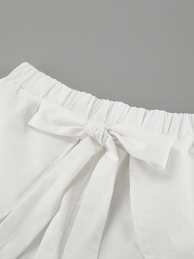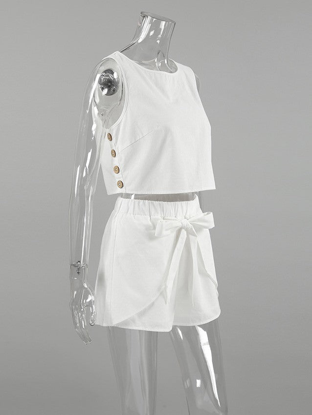 サイドのココナッツボタンがポイントのシンプルなタンクトップと、レイヤードデザインと大きなリボンがレディライクなショートパンツのセットです。
