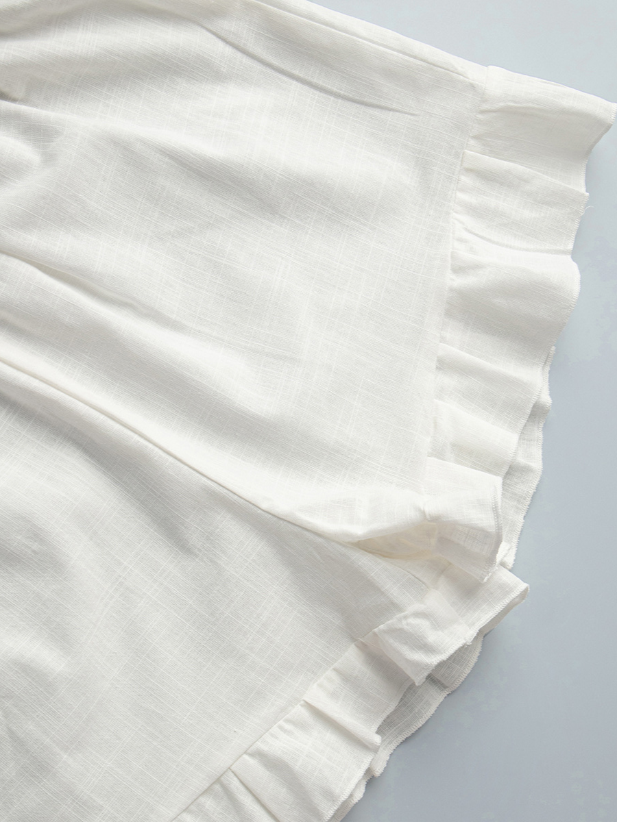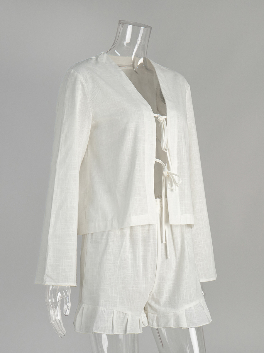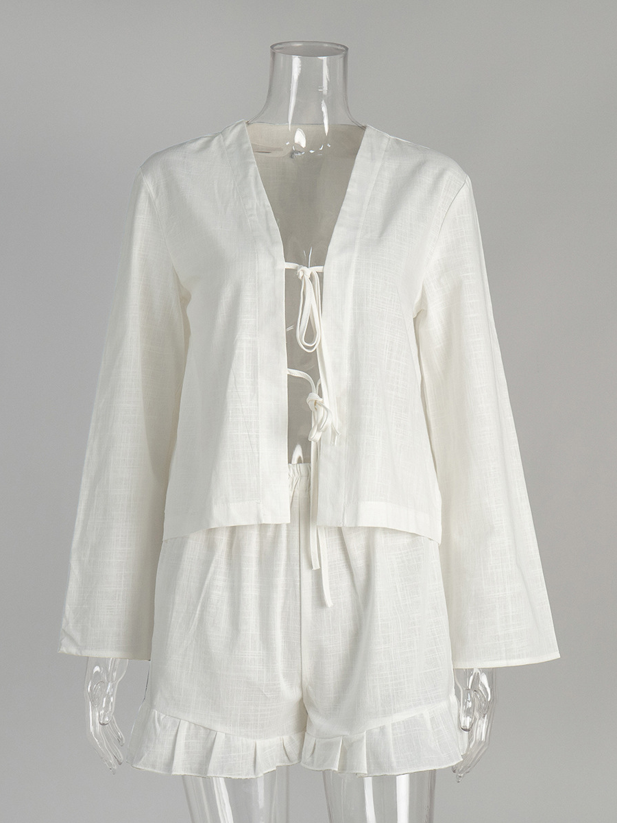人気のレースアップシリーズに、ジャスト丈にワイドスリーブシルエットで腕が長く見えてスタイルアップ効果も◎ショートパンツはウエストゴム仕様で裾のフリルデザインが、ガーリームードもプラス。