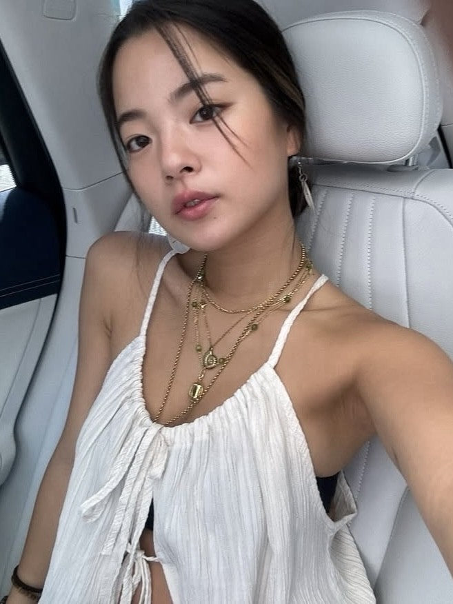 丸みのあるネックラインデザインに細めのホルターネック紐で、女性らしい印象に。パンツには、ヒップから裾まで裏地付きなので透けにくく安心。