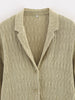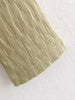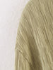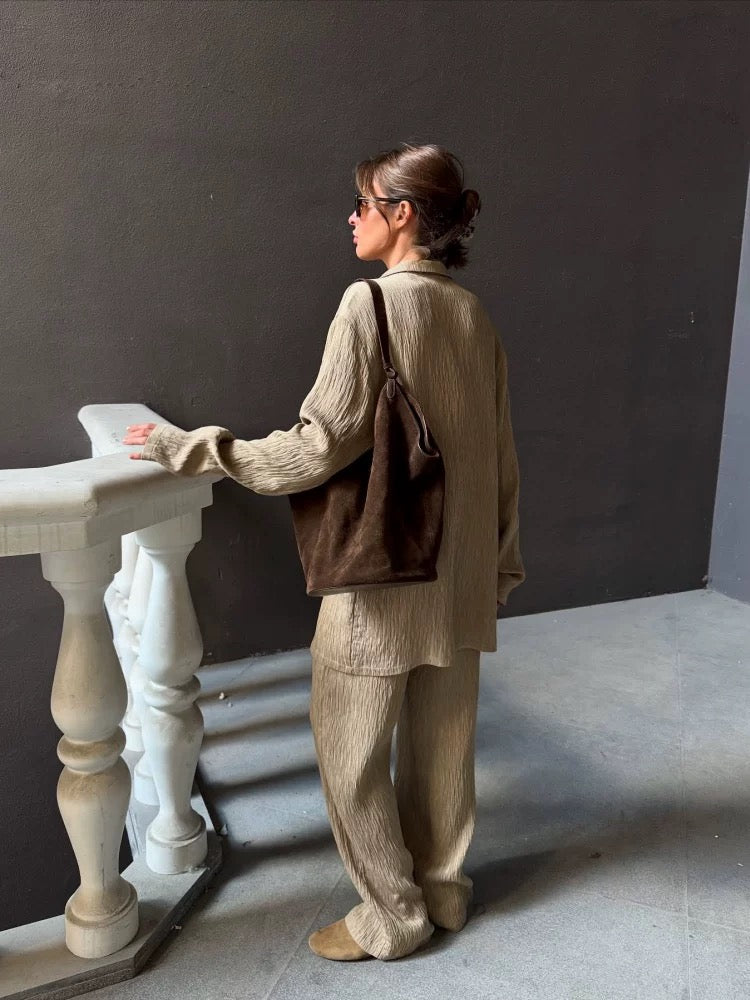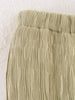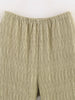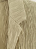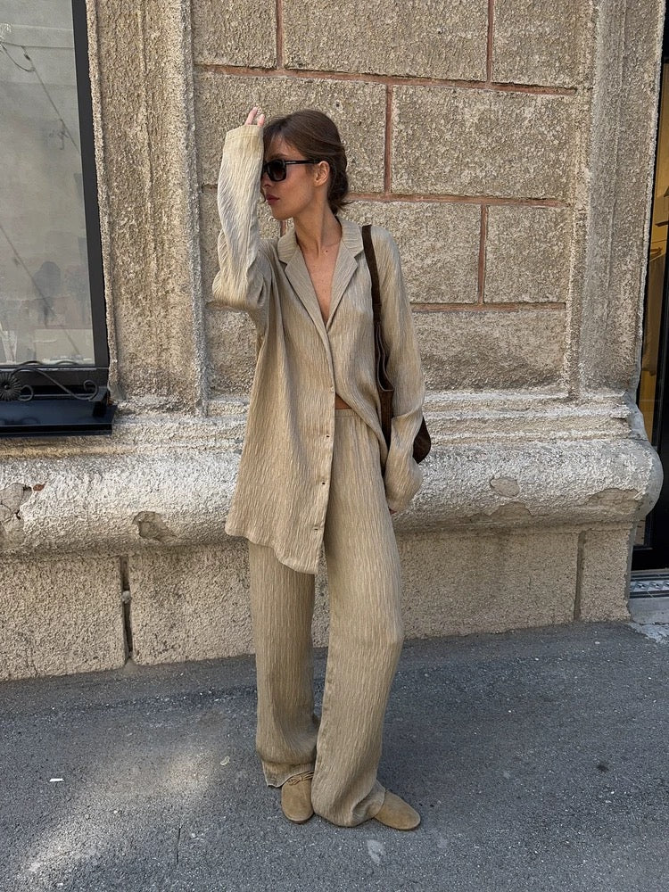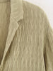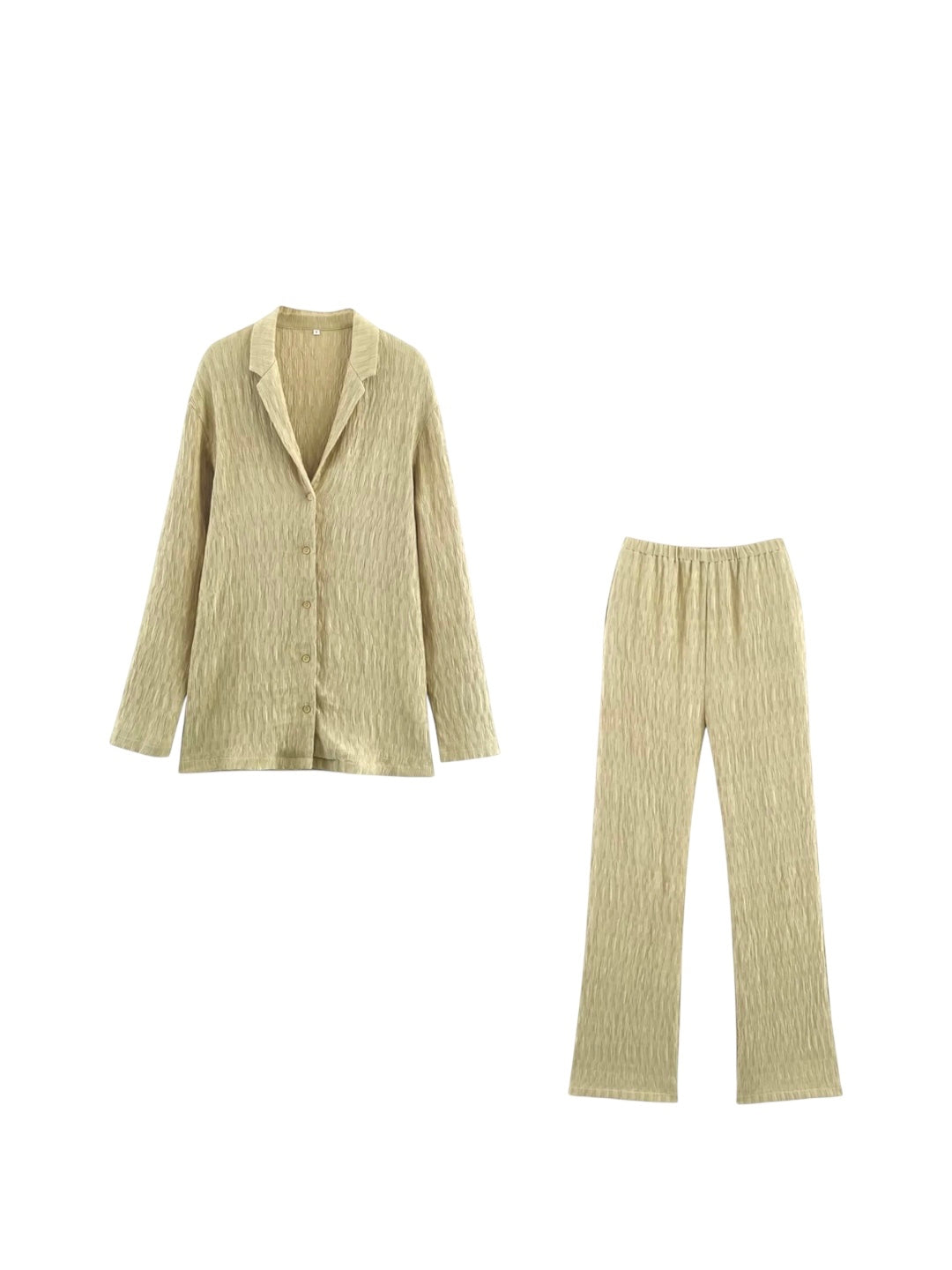 表面の凹凸テクスチャー生地が独特のデザインで印象的なセットアップは、オープンカラーのロング丈のシャツとウエストゴムでリラクシーな着心地のイージーパンツのセットになっています。