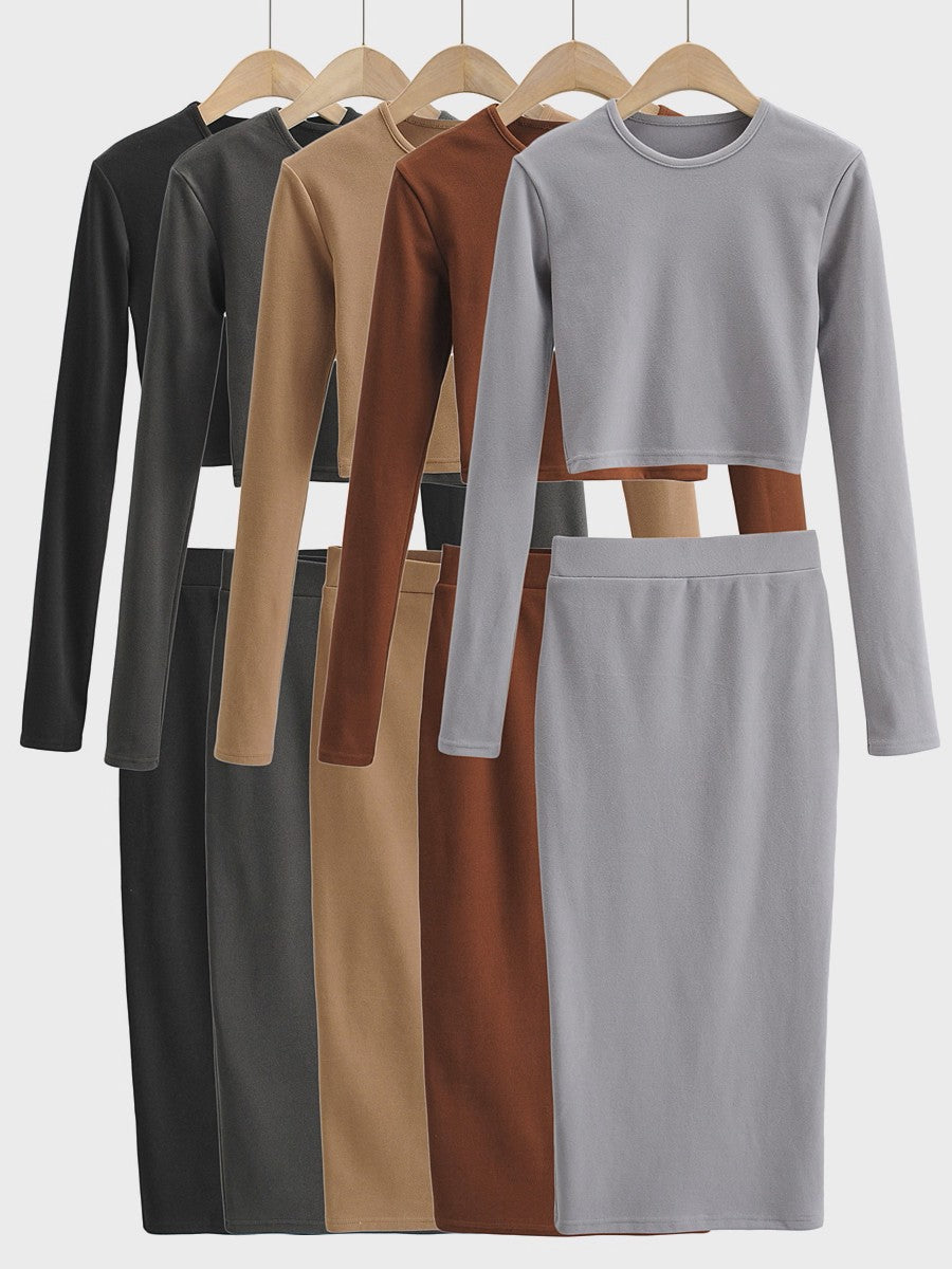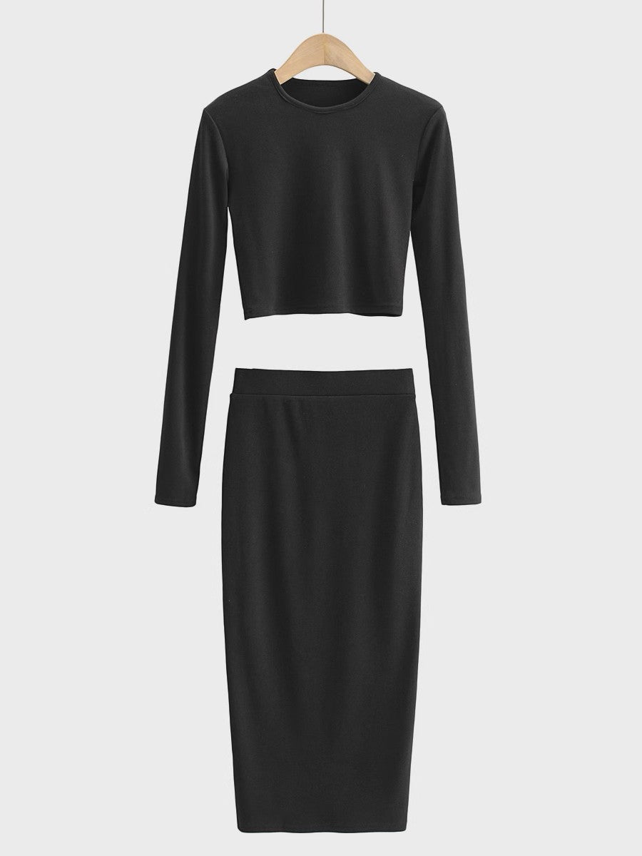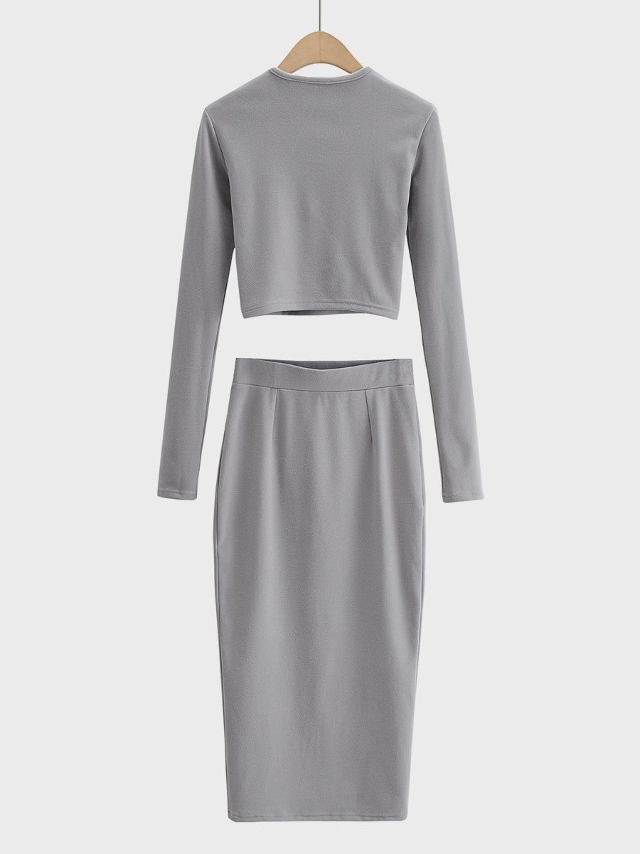 シンプルで洗練された佇まいが魅力の、クロップドトップとナロースカートのセットアップ。