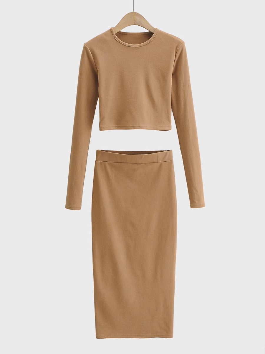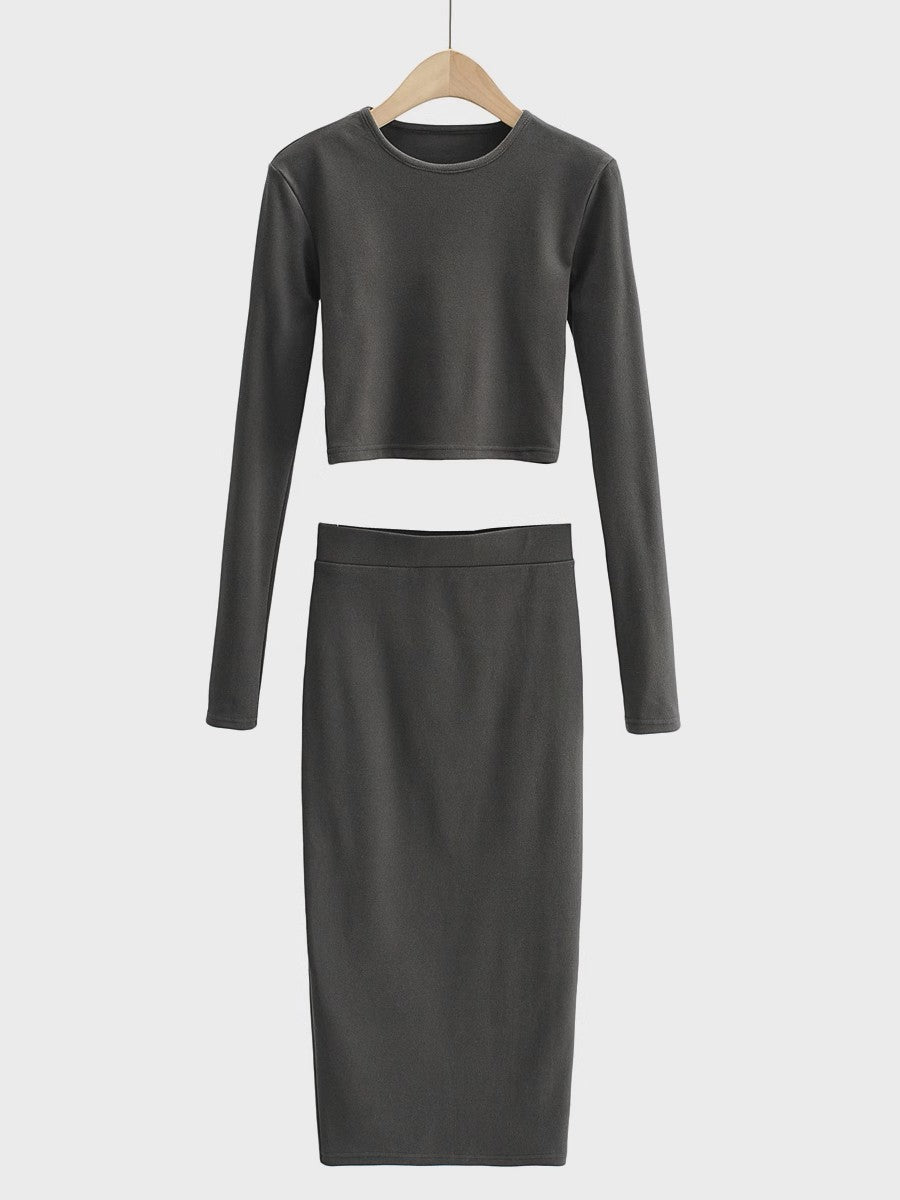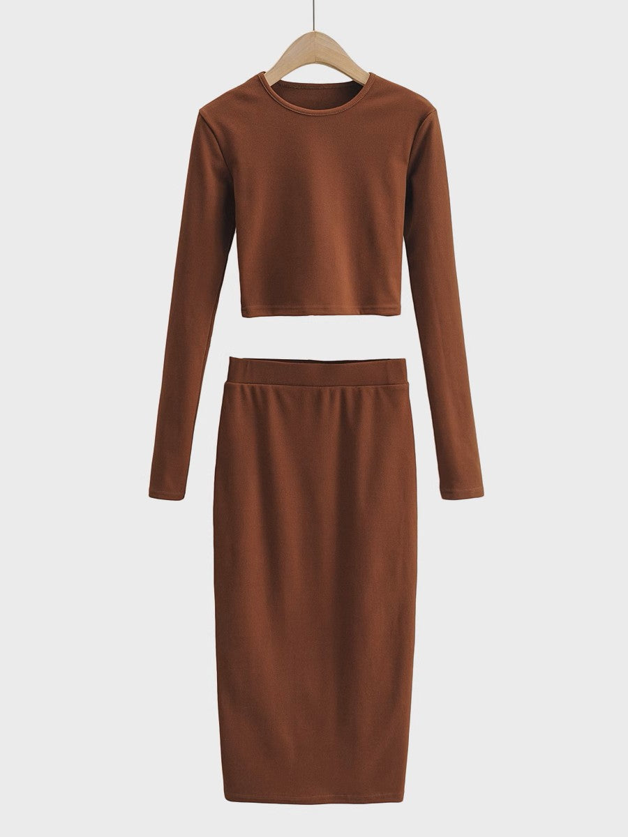 シンプルで洗練された佇まいが魅力の、クロップドトップとナロースカートのセットアップ。