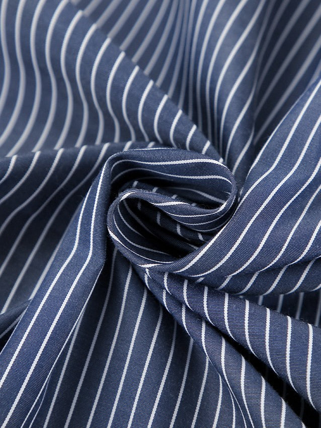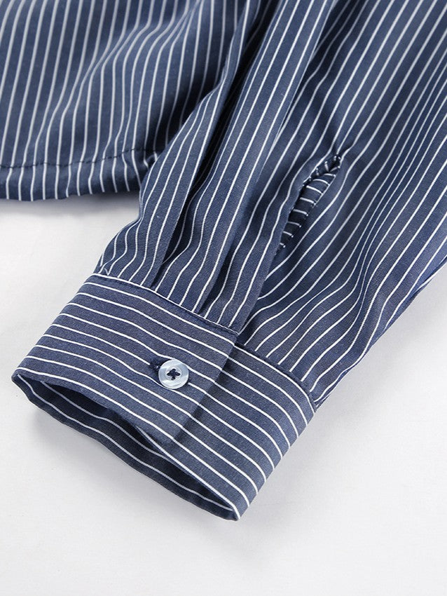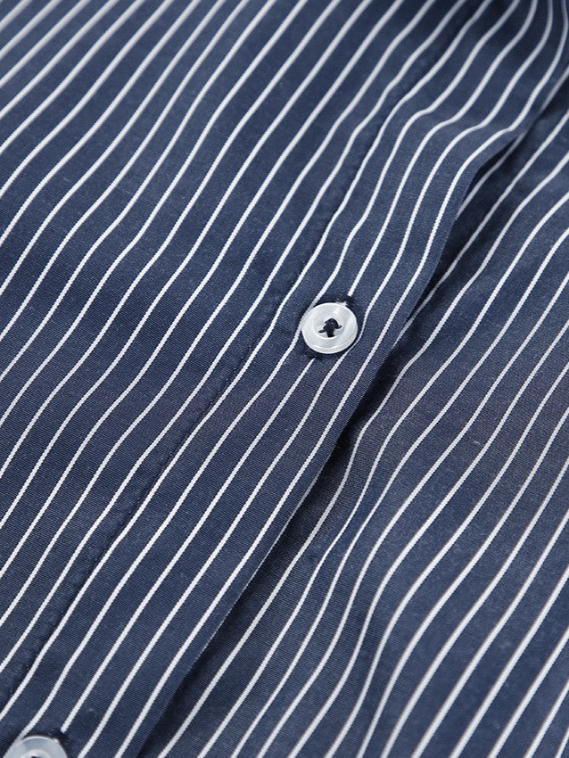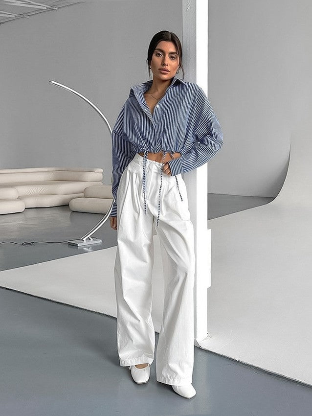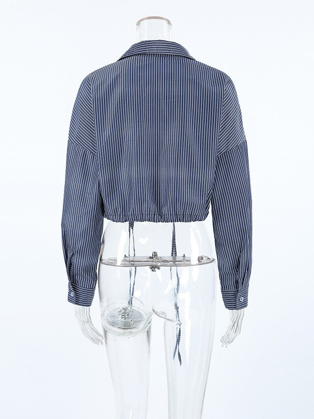 爽やかなストライプ柄のシャツは、裾が絞れるドローストリングデザインになっているので、すっきりしたシルエットで着用できます。