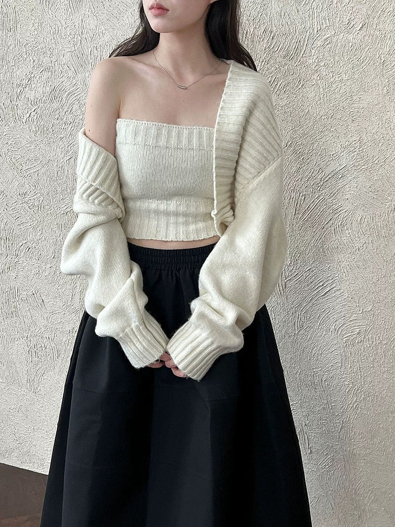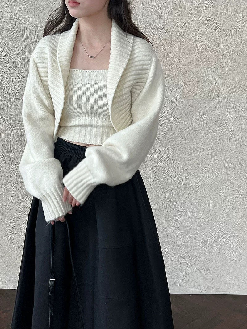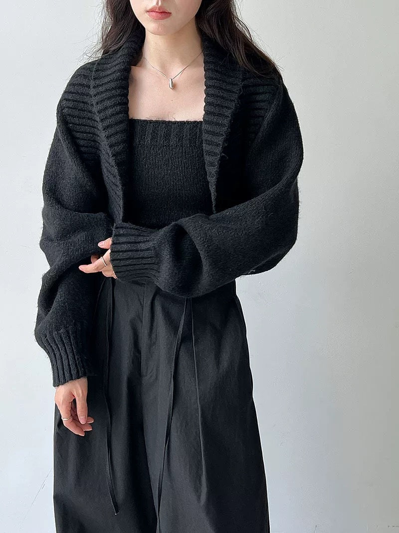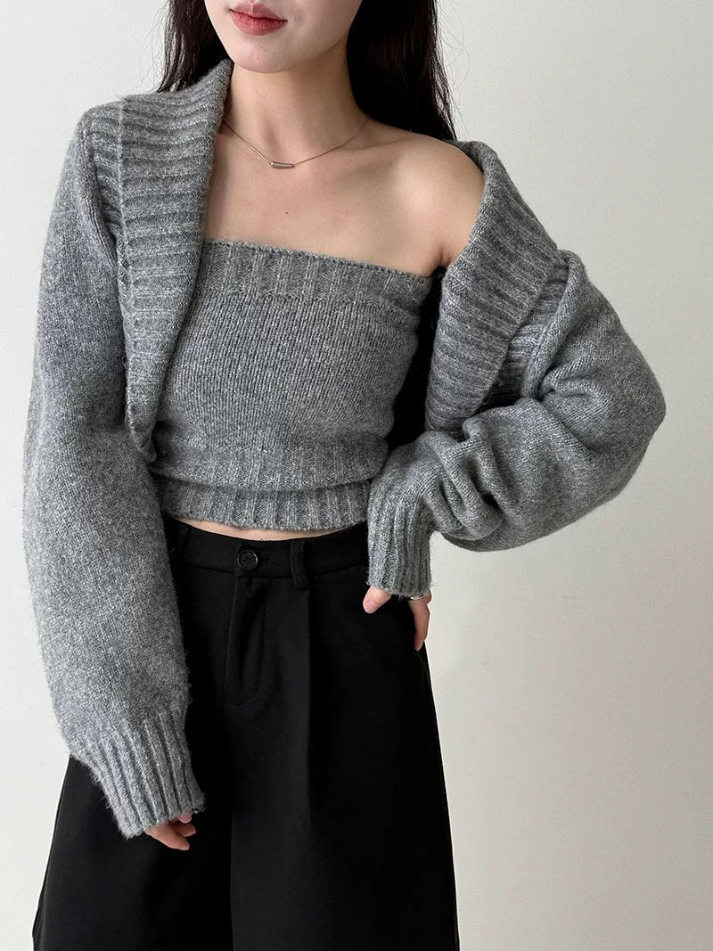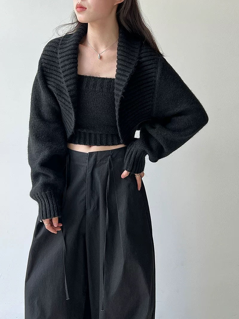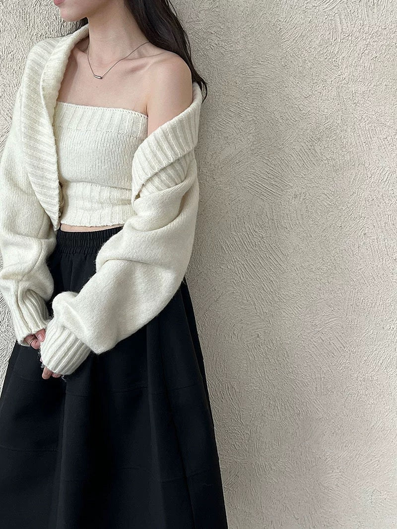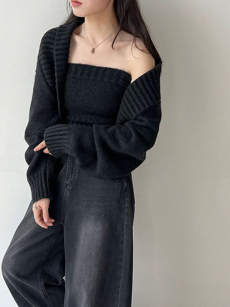 ウールブレンドで肉厚で温かいニット素材の、ボレロカーディガンとベアトップのセットになっています。