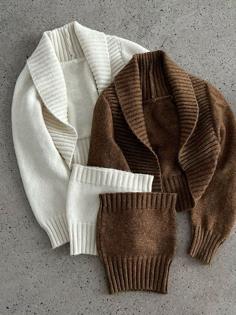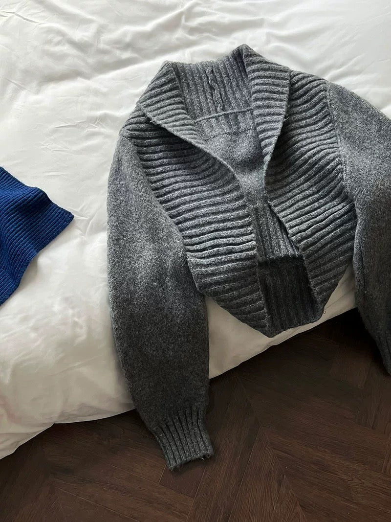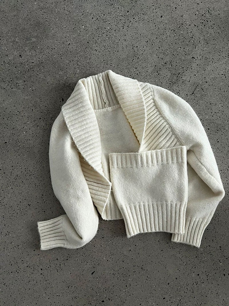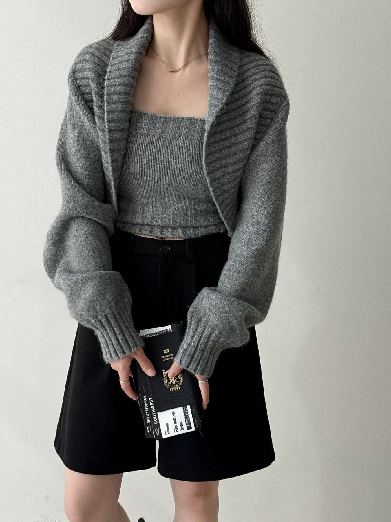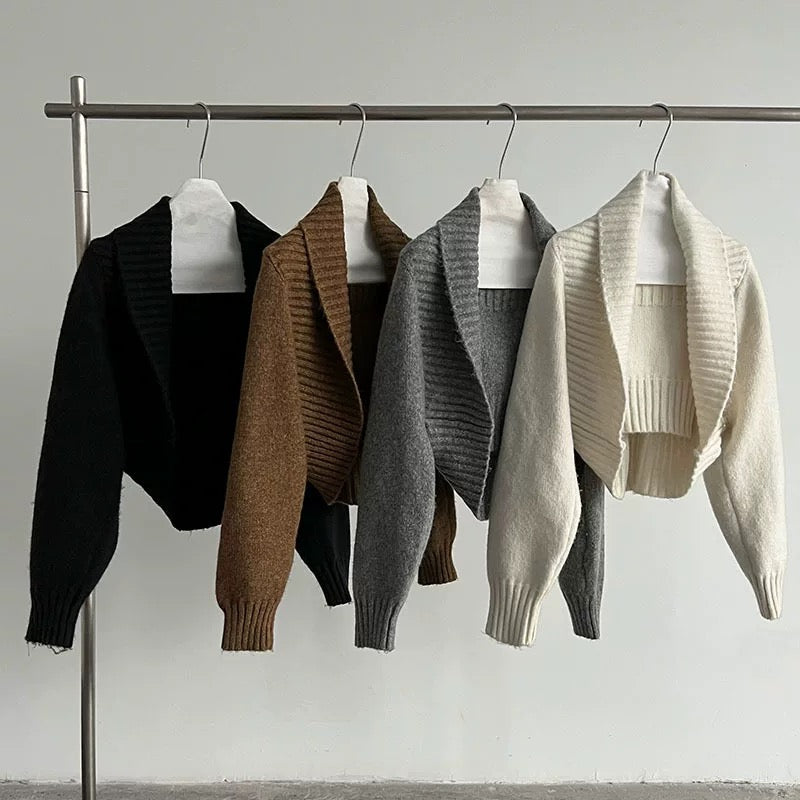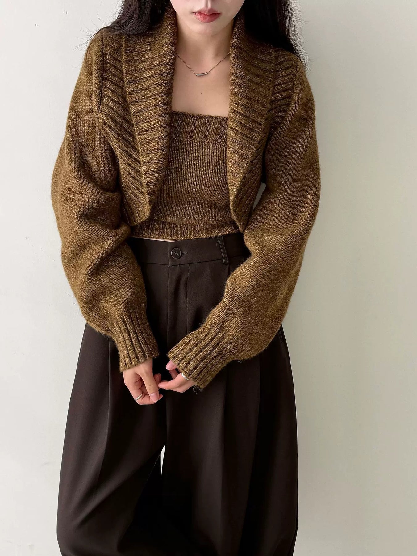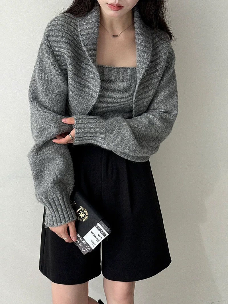 ウールブレンドで肉厚で温かいニット素材の、ボレロカーディガンとベアトップのセットになっています。