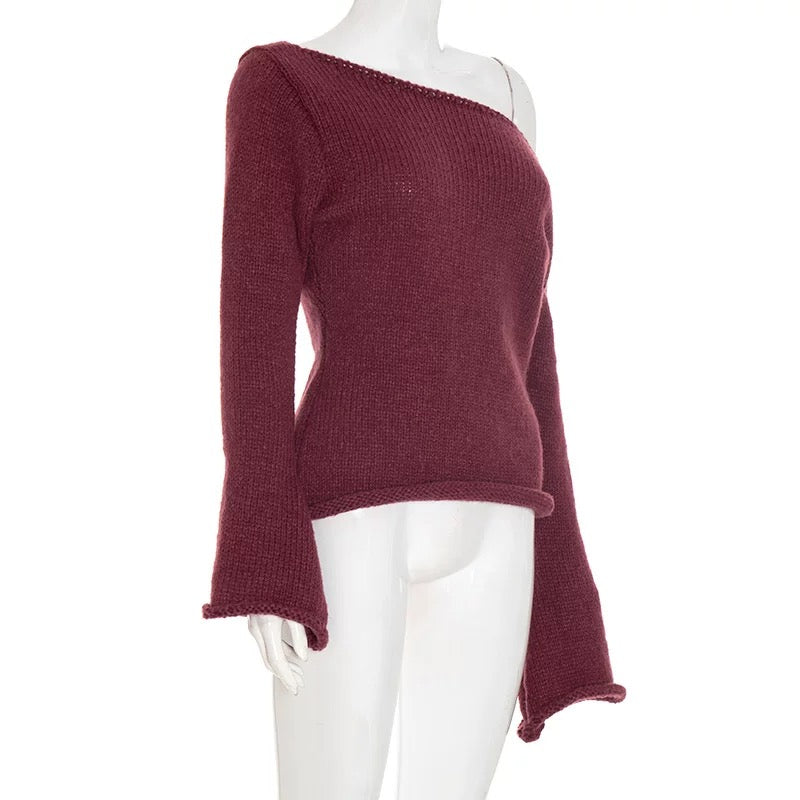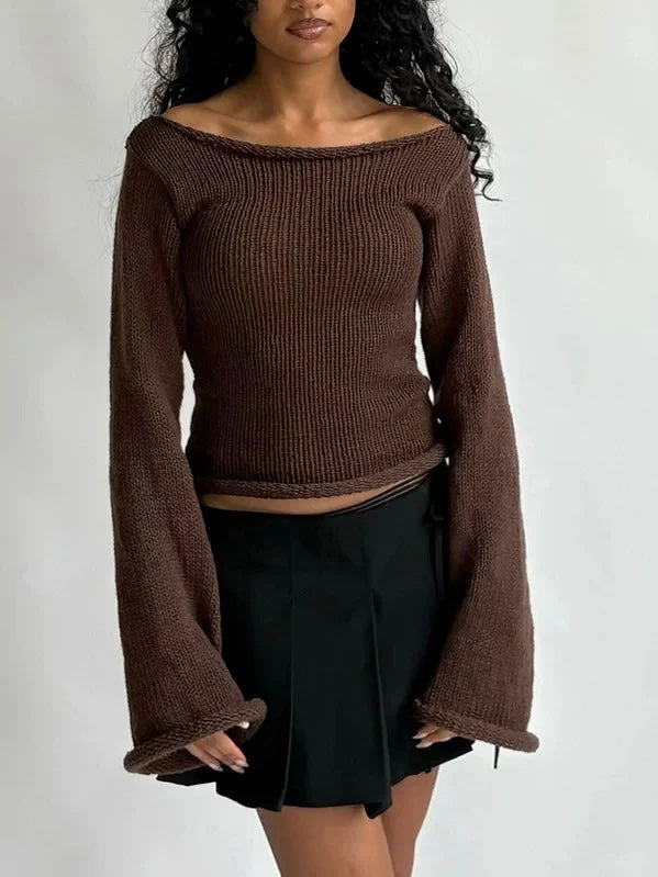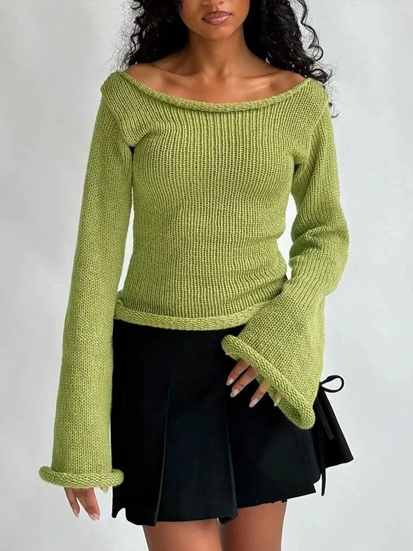 袖先、裾のカーリングデザインが立体感をつくり、長めのスリーブシルエットが女性らしい柔らかな印象を与えるニットは、オフショルダーで抜け感も演出。