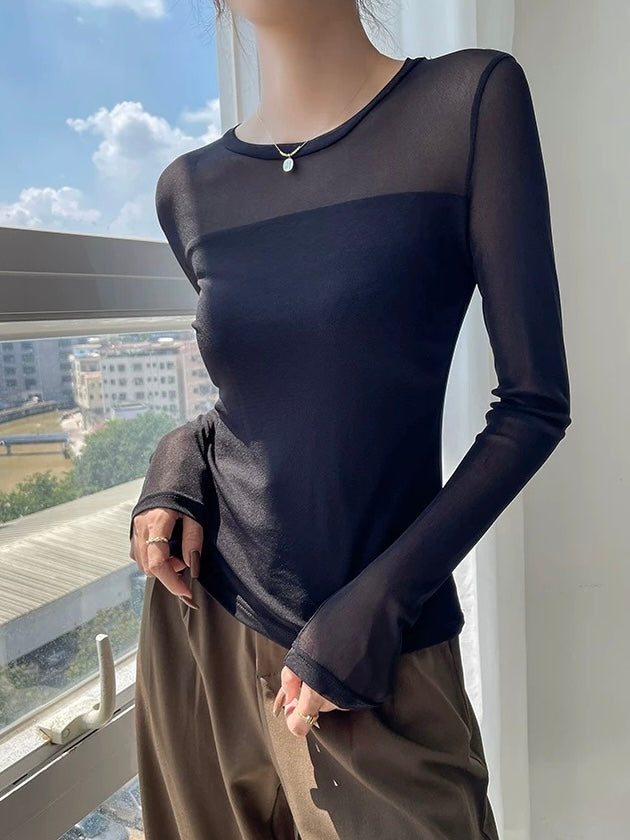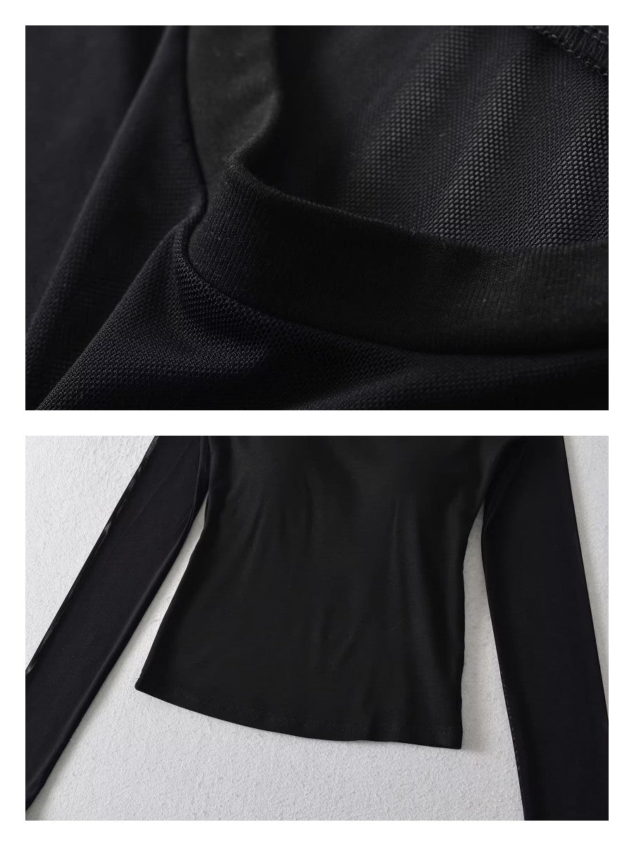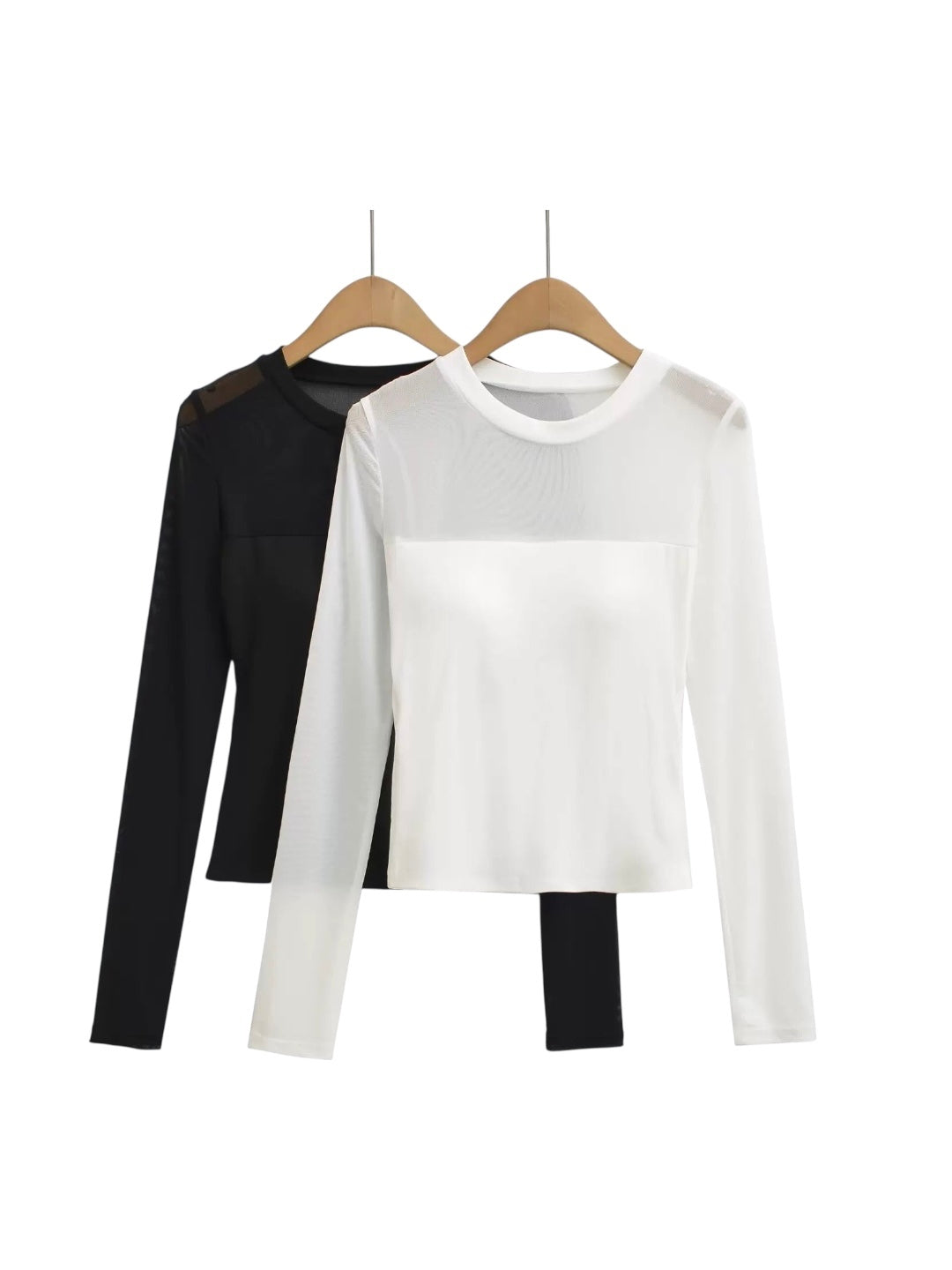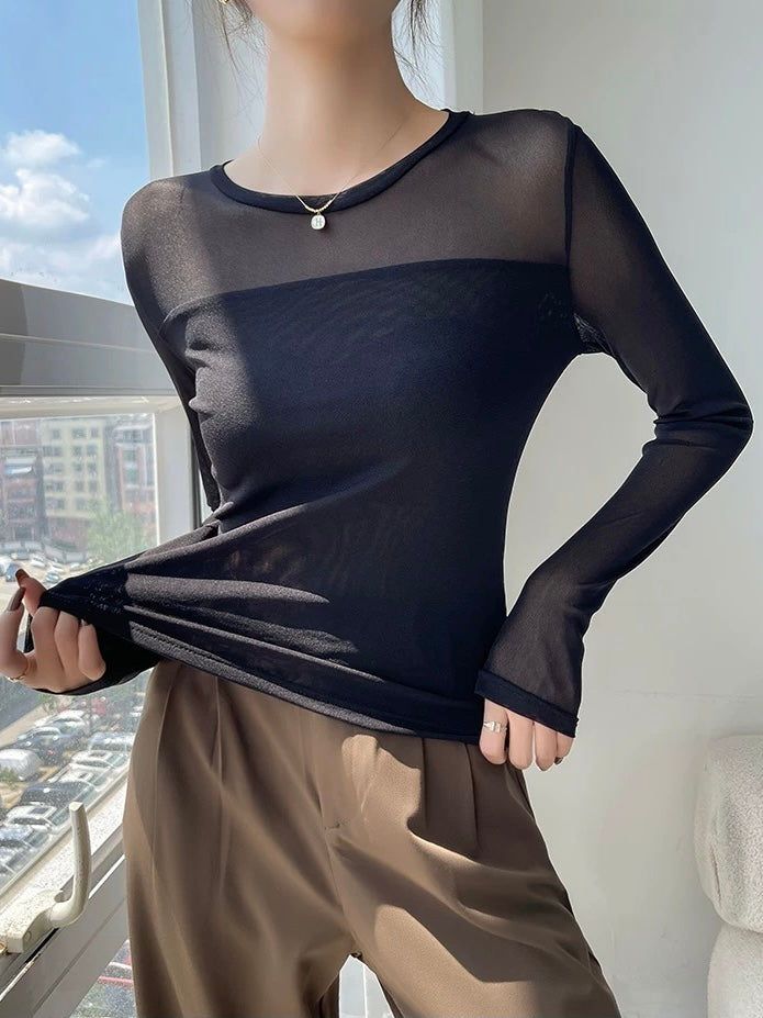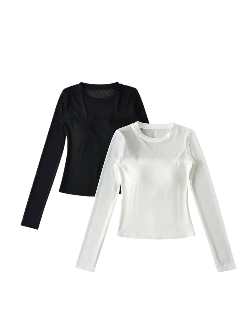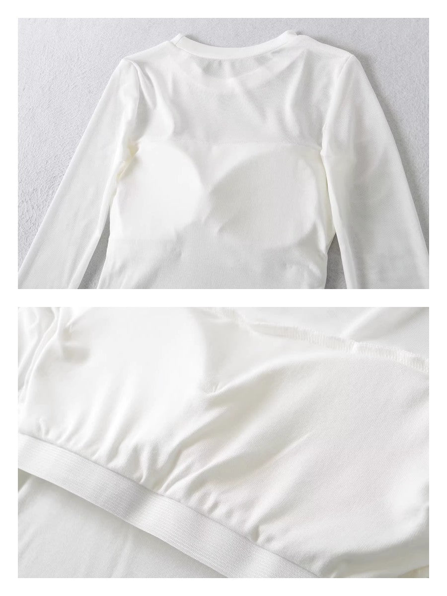 デコルテを美しく魅せる“シアーヨークデザイン”が特徴のカップ付きロングスリーブトップス。上部(肩〜胸上)と袖部分は軽く透けるメッシュ素材を使用し、ボディの部分は滑らかストレッチ生地でしっかり不透け&程よくフィット。