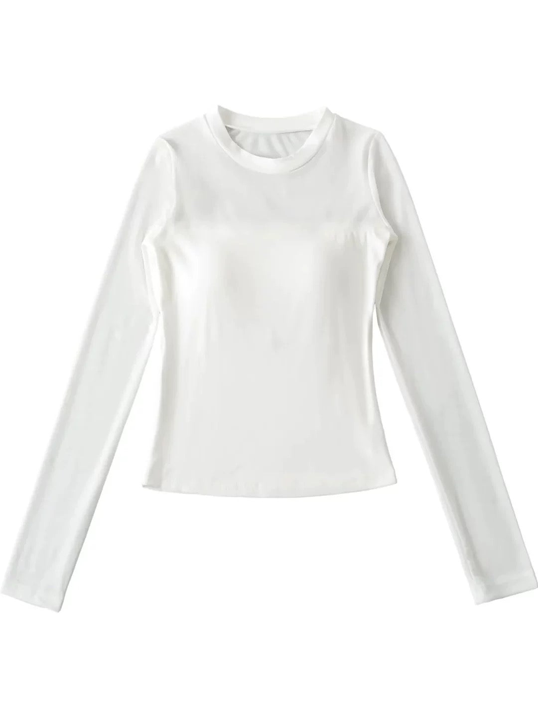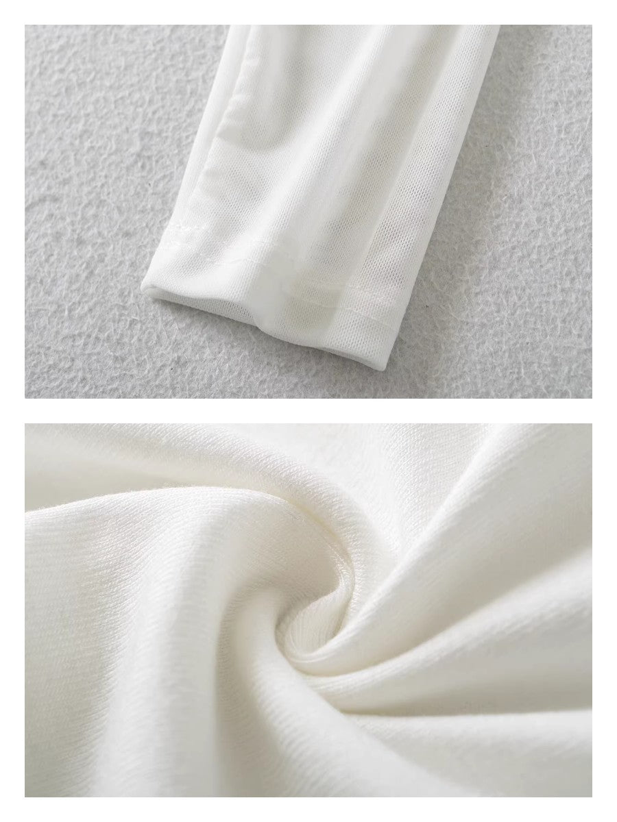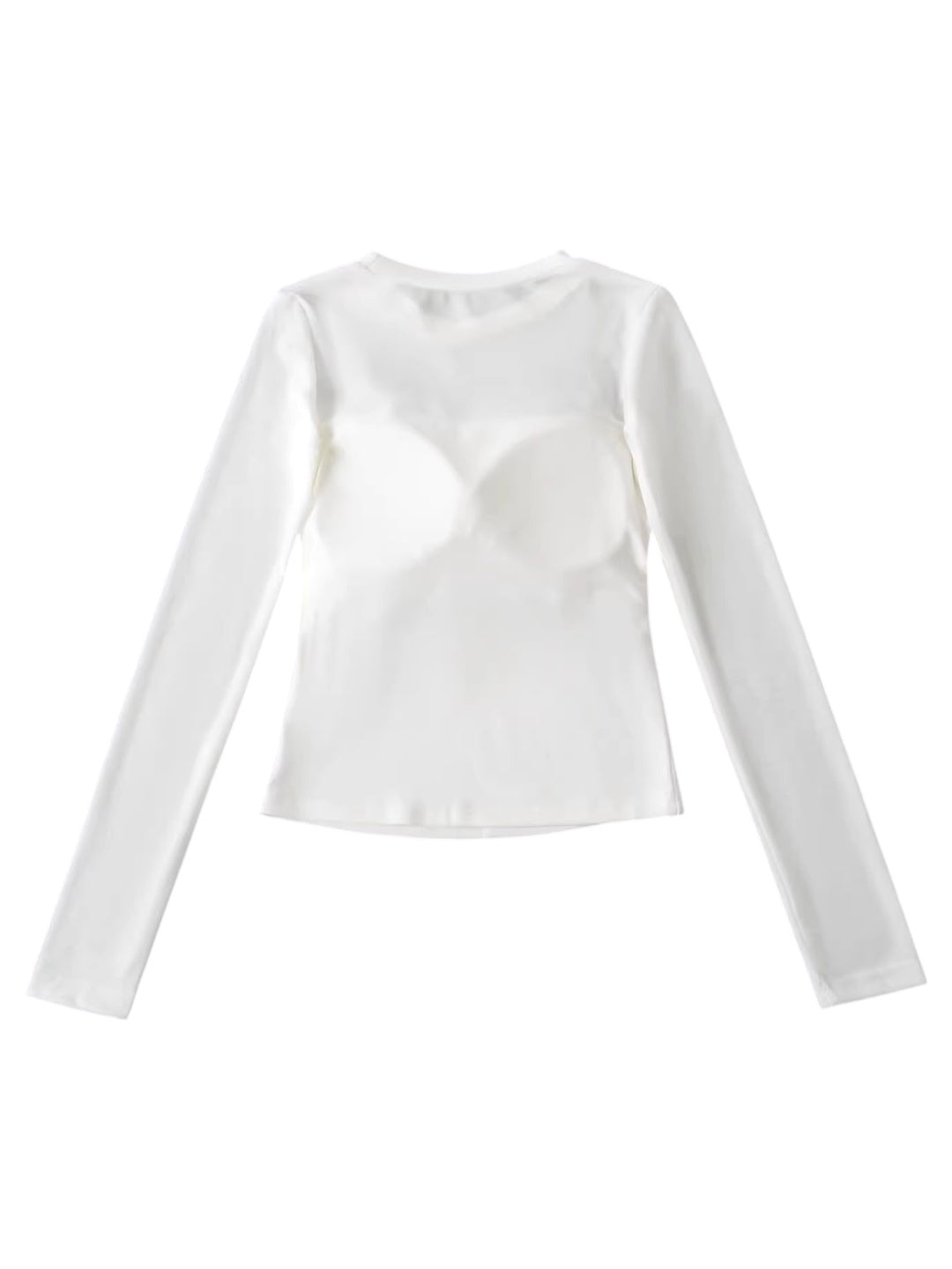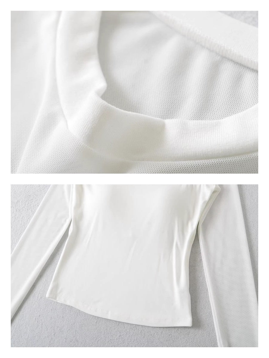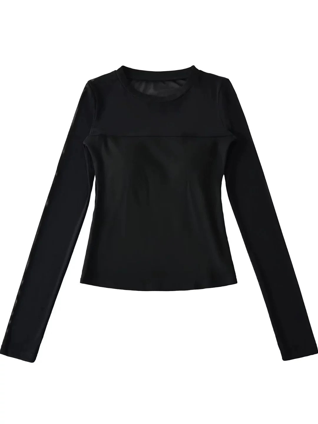 デコルテを美しく魅せる“シアーヨークデザイン”が特徴のカップ付きロングスリーブトップス。上部(肩〜胸上)と袖部分は軽く透けるメッシュ素材を使用し、ボディの部分は滑らかストレッチ生地でしっかり不透け&程よくフィット。