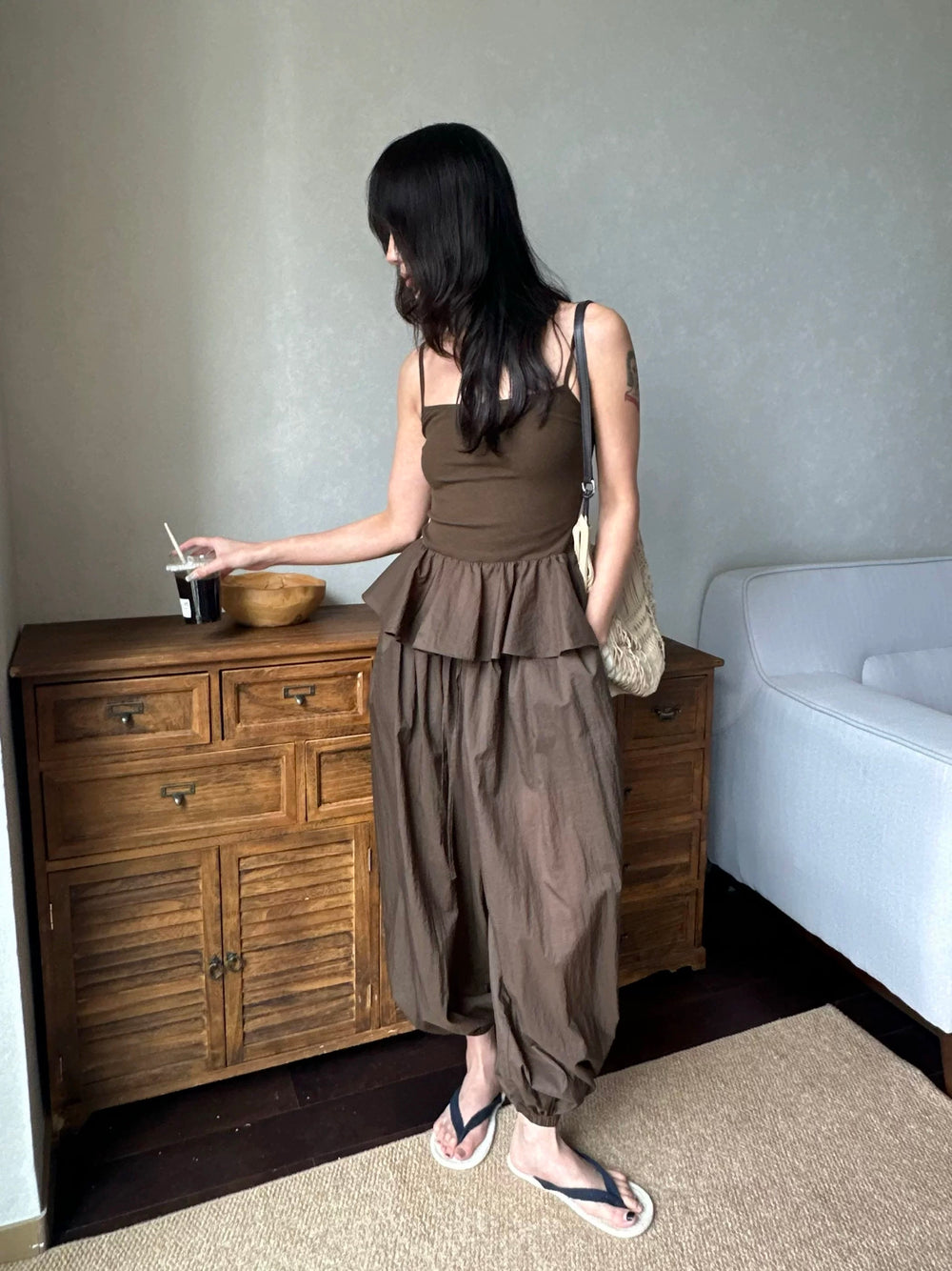 ぺプラムリブ切り替えキャミソールトップス